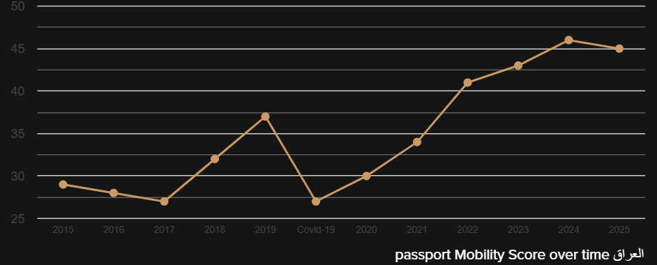 وبحسب مؤشر "هينلي" العالمي لقوة جوازات السفر، فقد جاء الجواز العراقي في قائمة أضعف الجوازات عالمياً، إلى جانب جوازات دول تعاني من أزمات داخلية حادة، مثل سوريا وأفغانستان واليمن. كما أظهر مؤشر "فيزا اندكس" أن الجواز العراقي تراجع خلال عام 2025، في وقت كانت فيه التوقعات تشير إلى تحسّن تدريجي بعد إطلاق الجواز الإلكتروني.