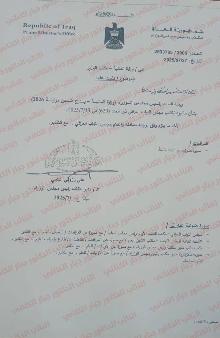 وثيقة رسمية السوداني يوجه بتثبيت كل العقود على موازنة 2026 الأربعاء 30 تموز 2025 سياسية 1,035 مشاهدة وثيقة رسمية السوداني يوجه بتثبيت كل العقود على موازنة 2026 وجه رئيس الوزراء محمد شياع السوداني، اليوم الأربعاء، كتاباً رسمياً إلى وزارة المالية بتثبيت كل العقود على موازنة 2026. التعليقات (0) لا توجد تعليقات بعد. كن أول من يعلق! اسمك البريد الإلكتروني تعليق إرسال التعليق تعليقاتكم والموضوعات الأكثر تداولاً أكثر المواضيع قراءة عرض الكل الأكثر قراءة اليوم الأسبوع الشهر سنة 1 إقتصادية أسعار صرف الدولار مع افتتاح الأسواق في العراق صباح الاثنين 791 مشاهدة --منذ 9 ساعة 2 أمن ومجتمع توضيح من الداخلية بشأن إحالة مشروع دمج البطاقة الوطنية لشركة سورية 731 مشاهدة --منذ 6 ساعة 3 مقالات العودة إلى الدولة والشعب... القرار الأسلم في التوقيت الأصعب 668 مشاهدة --منذ 7 ساعة 4 سياسية الحكومة تتجه لتوحيد كل المستمسكات في بطاقة واحدة 544 مشاهدة --منذ 24 ساعة 5 منوعة حالة "نادرة ومتقلبة" تسيطر على أجواء العراق حتى نهاية الأسبوع 319 مشاهدة --منذ 11 ساعة 1 إقتصادية تعرف على أسعار صرف الدولار مع إغلاق البورصة مساء الثلاثاء 2235 مشاهدة --الثلاثاء 09 كانون الأول 2025 2 إقتصادية الدولار يواصل ارتفاعه أمام الدينار العراقي مساء السبت 1871 مشاهدة --السبت 13 كانون الأول 2025 3 اخبار محلية بالفيديو:ظهور الرمال الصفراء قرب الحرم الحسيني اثناء عمليات الحفر 1518 مشاهدة --الأحد 14 كانون الأول 2025 4 تقارير مرشحو رئيس الوزراء يتقلصون إلى خمسة: هل يقترب الإطار من اختيار المرشح النهائي؟ 1320 مشاهدة --الثلاثاء 09 كانون الأول 2025 1 سياسية مجلس بغداد يُفعّل نظام التوصيل المنزلي للنفط الأبيض 4431 مشاهدة --الخميس 20 تشرين الثاني 2025 2 إقتصادية الدولار يواصل ارتفاعه أمام الدينار العراقي 3339 مشاهدة --الأربعاء 19 تشرين الثاني 2025 3 إقتصادية الدولار يواصل ارتفاعه أمام الدينار العراقي 3178 مشاهدة --الثلاثاء 25 تشرين الثاني 2025 4 سياسية دولة القانون تكشف عن مرشح جديد لرئاسة الوزراء 2777 مشاهدة --الأثنين 24 تشرين الثاني 2025 5 إقتصادية أسعار صرف الدولار مع إغلاق السوق مساء الأربعاء في العراق 2743 مشاهدة --الأربعاء 03 كانون الأول 2025 6 اخبار محلية كربلاء توزع حصة النفط الأبيض بالبطاقة الالكترونية رقم (٢) 2670 مشاهدة --الثلاثاء 18 تشرين الثاني 2025 1 اخبار محلية خلال زيارته لمشروع صحن العقيلة.. ممثل السيد السيستاني يوعز بتخصيص مساحة (5) الاف متر على اسطح البنايات للزائرين 18736 مشاهدة --السبت 13 ايلول 2025 2 سياسية مكتب السيد السيستاني ينشر إمساكيات شهر رمضان المبارك للمحافظات العراقية لعام 1446هـ (2025م) 14034 مشاهدة --الأربعاء 19 شباط 2025 3 لقاءات *محمد الصواف: عدسة توثق الحقيقة وتنقل قصص الإنسانية في قلب الأزمات* 12646 مشاهدة --الأحد 30 آذار 2025 4 لقاءات منها الخاصة وفوق الكبرى والكبرى.. حيدر زيني.. طبيب أجرى (51) عملية في (28) ساعة متواصلة بمستشفى السفير 11272 مشاهدة --الثلاثاء 27 آيار 2025 5 اخبار محلية كربلاء تحدد تسعيرة "أمبير" المولدات الأهلية لشهر حزيران 2025 9845 مشاهدة --الثلاثاء 27 آيار 2025 6 تحقيقات بينَ زَخَّاتِ الرَّصاصِ وَدُموعِ الأهلِ.. قِصةُ شهيدٍ كَتبَتْ كربلاءُ خاتِمَتَهُ 9264 مشاهدة --الأربعاء 02 نيسان 2025 آخر التعليقات 1 طالب عبدالله حسين التعليق : اريد هذا الكتاب كامل ... الموضوع : قراءة في كتاب تاريخ الشطرة خلال العهد العثماني دراسة.د . شاكر الشطري 2 скачать фильмы бесплатно русские серии التعليق : Подыскиваете место российские драматические и боевики без регистрации и полностью бесплатно в высоком разрешении? Тогда ... الموضوع : سندات مالية جديدة.. الفائدة المصرفية تحبط خطط الحكومة لسد العجز 3 قيس الشاهين التعليق : وفق الله الجميع لما فيه خير وصلاح هذه الامة وجزى الله المنقذموظف الغابة العباسبة المقدسة ... الموضوع : منتسب بالعتبة العباسية ينقذ طفلا تائها في منطقة صحراوية بمحافظة ميسان 4 Alshereffy Najim التعليق : أنا من اشد ا