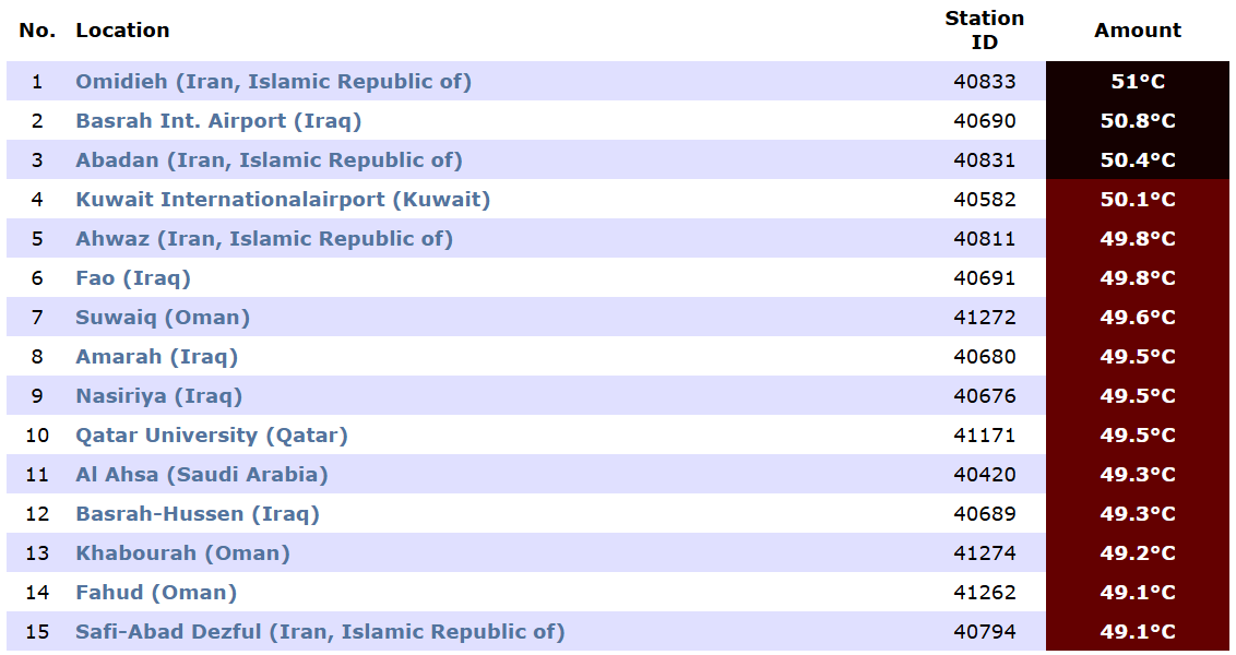 وتصدّرت الحميدية في إيران القائمة بدرجة حرارة بلغت 51.0 مئوية، تلتها مطار البصرة الدولي في العراق في المركز الثاني بـ50.8 مئوية، ثم عبادان الإيرانية ثالثًا بـ50.4 مئوية.