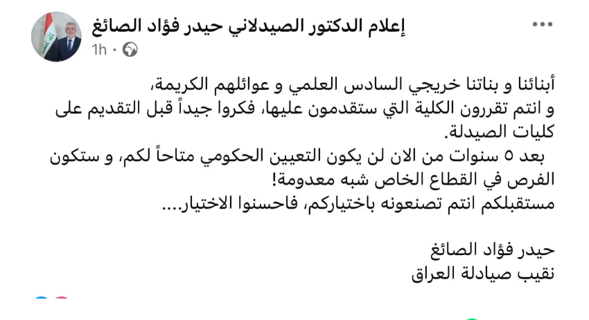 نقيب صيادلة العراق لخريجي السادس الإعدادي: لا تقدموا على كليات الصيدلة الأثنين 04 آب 2025 سياسية 1,060 مشاهدة نقيب صيادلة العراق لخريجي السادس الإعدادي: لا تقدموا على كليات الصيدلة دعا نقيب صيادلة العراق حيدر فؤاد الصائغ، اليوم الإثنين، خريجي السادس الإعدادي إلى عدم التقديم على كليات الصيدلة. وقال الصائغ في تدوينة تابعتها(الرابعة)، إنه"بعد 5 سنوات، لن يكون هنالك أي تعيين حكومي للصيادلة". كلمات مفتاحية العراق الاعداد السادس الاعدادي التقديم #العراق الصيد الصيدلة تدوينة التعليقات (0) لا توجد تعليقات بعد. كن أول من يعلق! اسمك البريد الإلكتروني تعليق إرسال التعليق تعليقاتكم والموضوعات الأكثر تداولاً أكثر المواضيع قراءة عرض الكل الأكثر قراءة اليوم الأسبوع الشهر سنة 1 إقتصادية تعرف على أسعار صرف الدولار أمام الدينار العراقي 1724 مشاهدة --منذ 19 ساعة 2 إقتصادية الدولار يرتفع مع إغلاق الأسواق في العراق 917 مشاهدة --منذ 17 ساعة 3 سياسية ضجة بمواقع التواصل بعد نشر الوقائع العراقية قرارات تصنف حزب الله والحوثيين "منظمات ارهابية" 480 مشاهدة --منذ 22 ساعة 4 اخبار محلية يباشر بتنفيذه في (27) رجب.. ممثل السيستاني يطلع على تصاميم اكبر صحون التوسعة في العتبة الحسينية 440 مشاهدة --منذ 13 ساعة 5 سياسية العراق.. التحقيق باستهداف حقل خور مور يتوصل لأسماء منفذي الهجوم 423 مشاهدة --منذ 24 ساعة 1 إقتصادية مع إغلاق السوق.. تعرف على أسعار صرف الدولار في العراق 2156 مشاهدة --السبت 29 تشرين الثاني 2025 2 إقتصادية ارتفاع أسعار صرف الدولار الأمريكي أمام الدينار العراقي 2041 مشاهدة --السبت 29 تشرين الثاني 2025 3 اخبار محلية تخفيضات كبيرة لمدة اسبوعين .. مستشفى الامام زين العابدين (ع) في كربلاء يطلق مبادرة (كوثر العصمة) الطبية 1920 مشاهدة --الجمعة 28 تشرين الثاني 2025 4 إقتصادية أسعار صرف الدولار مع إغلاق السوق مساء الأربعاء في العراق 1730 مشاهدة --الأربعاء 03 كانون الأول 2025 1 سياسية نتائج اولية :الفائزون في مقاعد مجلس النواب بكربلاء المقدسة 8391 مشاهدة --الأربعاء 12 تشرين الثاني 2025 2 سياسية بالارقام: النتائج الأولية للتصويت بالانتخابات النيابية في محافظة نينوى 6545 مشاهدة --الثلاثاء 11 تشرين الثاني 2025 3 اخبار محلية اسماء جديدة تشكل 11 فائز بانتخابات 2025 في محافظة كربلاء المقدسة 4233 مشاهدة --الخميس 13 تشرين الثاني 2025 4 سياسية مجلس بغداد يُفعّل نظام التوصيل المنزلي للنفط الأبيض 3960 مشاهدة --الخميس 20 تشرين الثاني 2025 5 سياسية وكالة نون تنشر النتائج الاولية للقوائم الانتخابية الفائزة في محافظة واسط 3722 مشاهدة --الأربعاء 12 تشرين الثاني 2025 6 منوعة طقس العراق.. أمطار رعدية وانخفاض في درجات الحرارة 3550 مشاهدة --الجمعة 14 تشرين الثاني 2025 1 اخبار محلية خلال زيارته لمشروع صحن العقيلة.. ممثل السيد السيستاني يوعز بتخصيص مساحة (5) الاف متر على اسطح البنايات للزائرين 18320 مشاهدة --السبت 13 ايلول 2025 2 سياسية مكتب السيد السيستاني ينشر إمساكيات شهر رمضان المبارك للمحافظات العراقية لعام 1446هـ (2025م) 13582 مشاهدة --الأربعاء 19 شباط 2025 3 لقاءات *محمد الصواف: عدسة توثق الحقيقة وتنقل قصص الإنسانية في قلب الأزمات* 12249 مشاهدة --الأحد 30 آذار 2025 4 لقاءات منها الخاصة وفوق الكبرى والكبرى.. حيدر زيني.. طبيب أجرى (51) عملية في (28) ساعة متواصلة بمستشفى السفير 10784 مشاهدة --الثلاثاء 27 آيار 2025 5 اخبار محلية كربلاء تحدد تسعيرة "أمبير" المولدات الأهلية لشهر حزيران 2025 9454 مشاهدة --الثلاثاء 27 آيار 2025 6 تحقيقات بينَ زَخَّاتِ الرَّصاصِ وَدُموعِ الأهلِ.. قِصةُ شهيدٍ كَتبَتْ كربلاءُ خاتِمَتَهُ 8895 مشاهدة --الأربعاء 02 نيسان 2025 آخر التعليقات 1 محمد فارس ريان التعليق : الخيانة لها ناسها ... الموضوع : القصة الكاملة لعملية اعتقال طه ياسين رمضان "الجزراوي" 2 محمد فارس ريان التعليق : الخيانة لها ناسها ... الموضوع : القصة الكاملة لعملية اعتقال طه ياسين رمضان "الجزراوي" 3 RonaldNet التعليق : Ребята, подскажите, кто как решал проблему, когда за