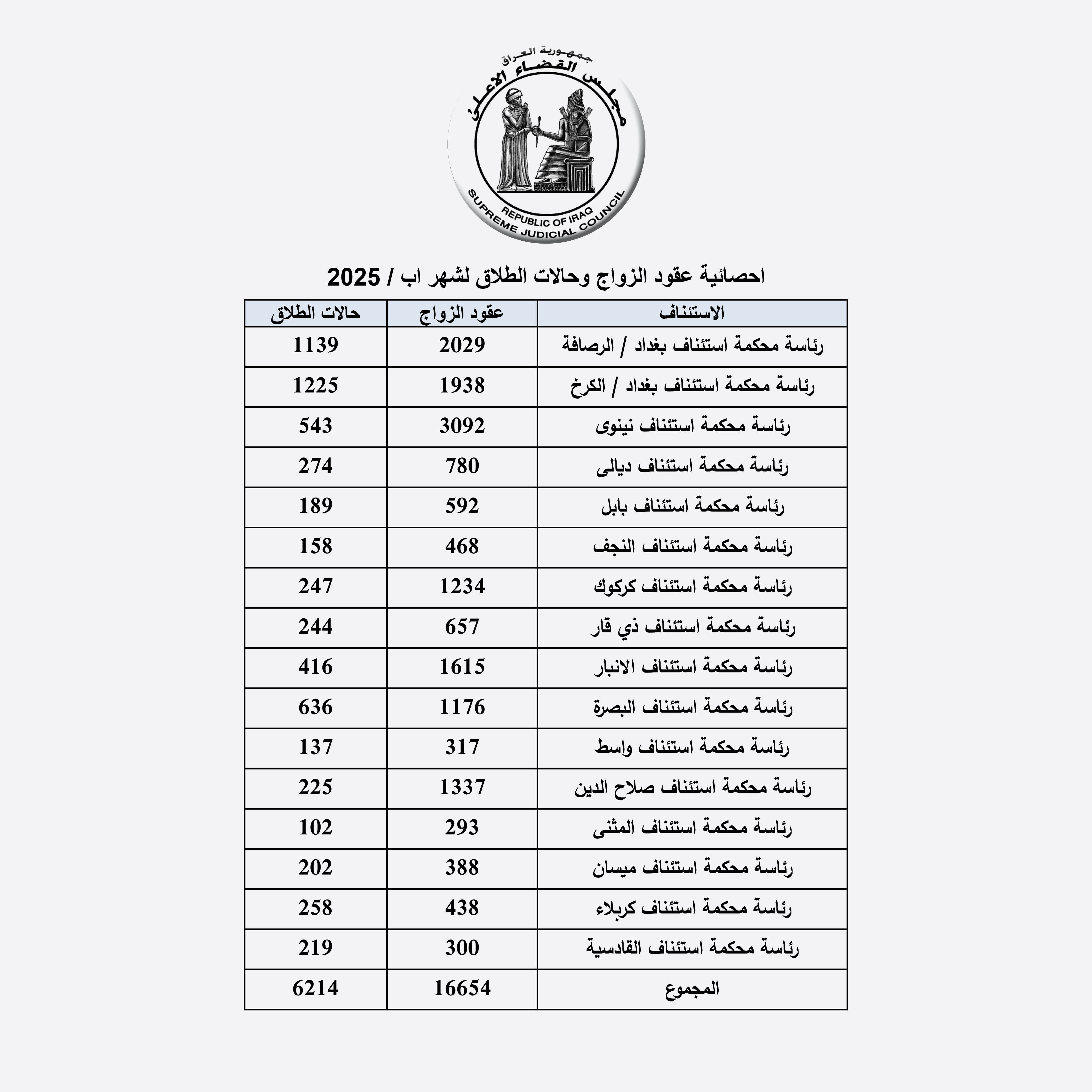 ووفقًا للبيانات الصادرة عن محاكم الاستئناف في العراق، والتي تغطي الفترة الشهرية المنتهية في آب 2025، سجلت محكمة استئناف نينوى أعلى عدد لعقود الزواج بواقع 3,092 عقد، تليها رئاسة محكمة استئناف بغداد / الرصافة بـ 2,029 عقد، ثم محكمة استئناف بغداد / الكرخ بـ 1,938 عقد.