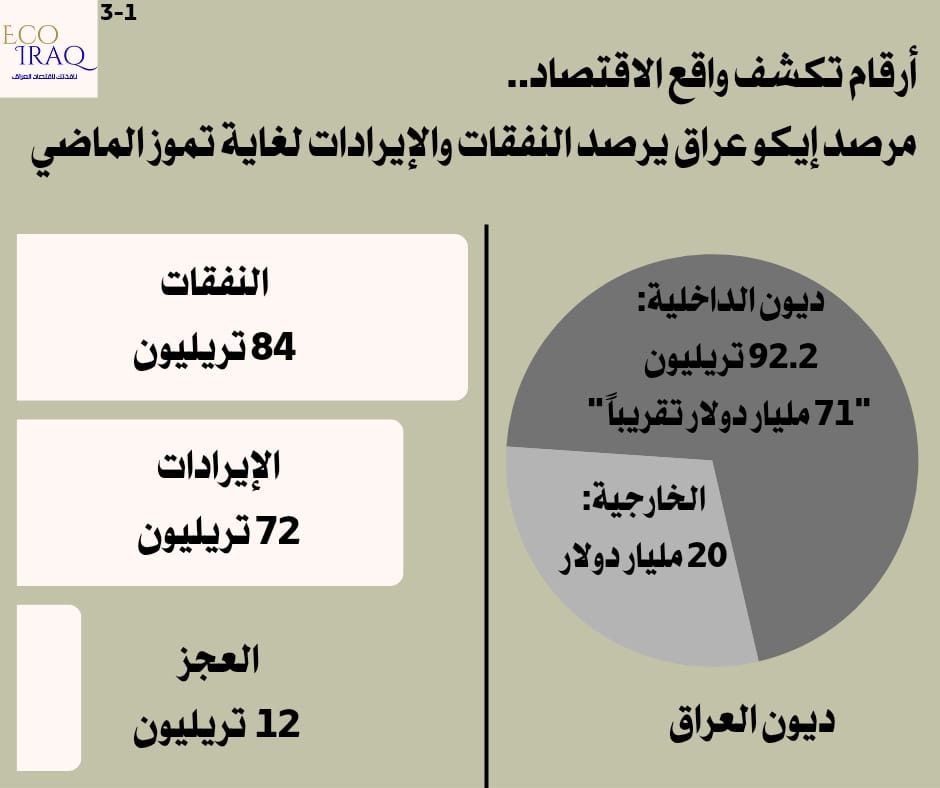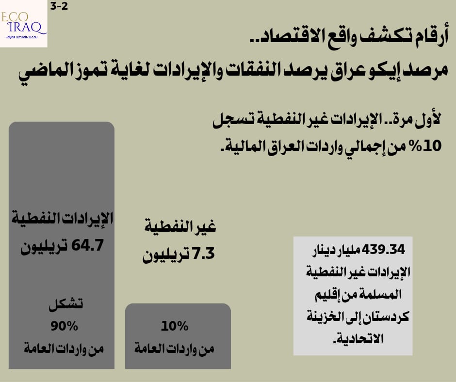 رصد مرصد "إيكو عراق" المتخصص في الشؤون الاقتصادية، اليوم السبت، عجزاً مالياً في الاقتصاد العراقي بلغ 12.15 تريليون دينار حتى نهاية شهر تموز الماضي، فيما سجلت الإيرادات غير النفطية للمرة الأولى نسبة 10% من إجمالي الإيرادات العامة.