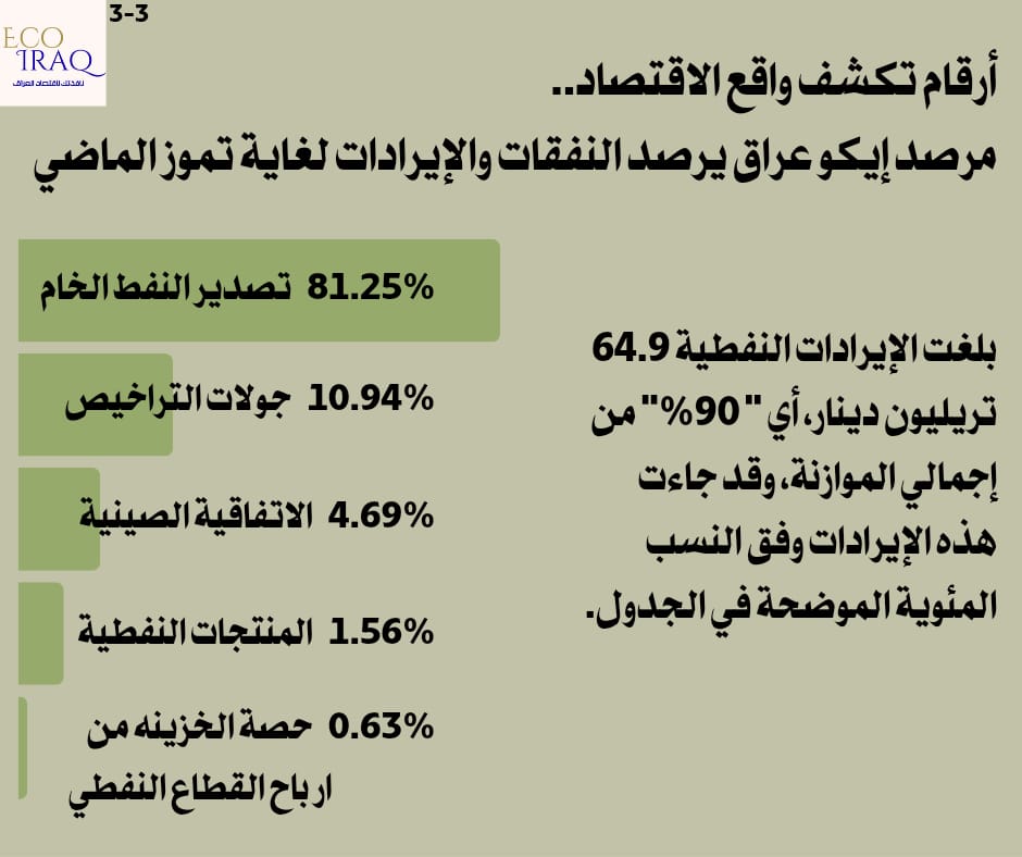 وبيّن المرصد أن الإيرادات النفطية وصلت إلى 64.96 تريليون دينار، مما يجعل العجز المالي الفعلي حتى نهاية تموز نحو 12.15 تريليون دينار عراقي.