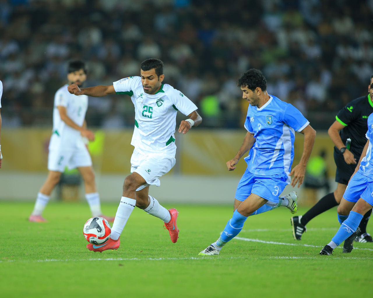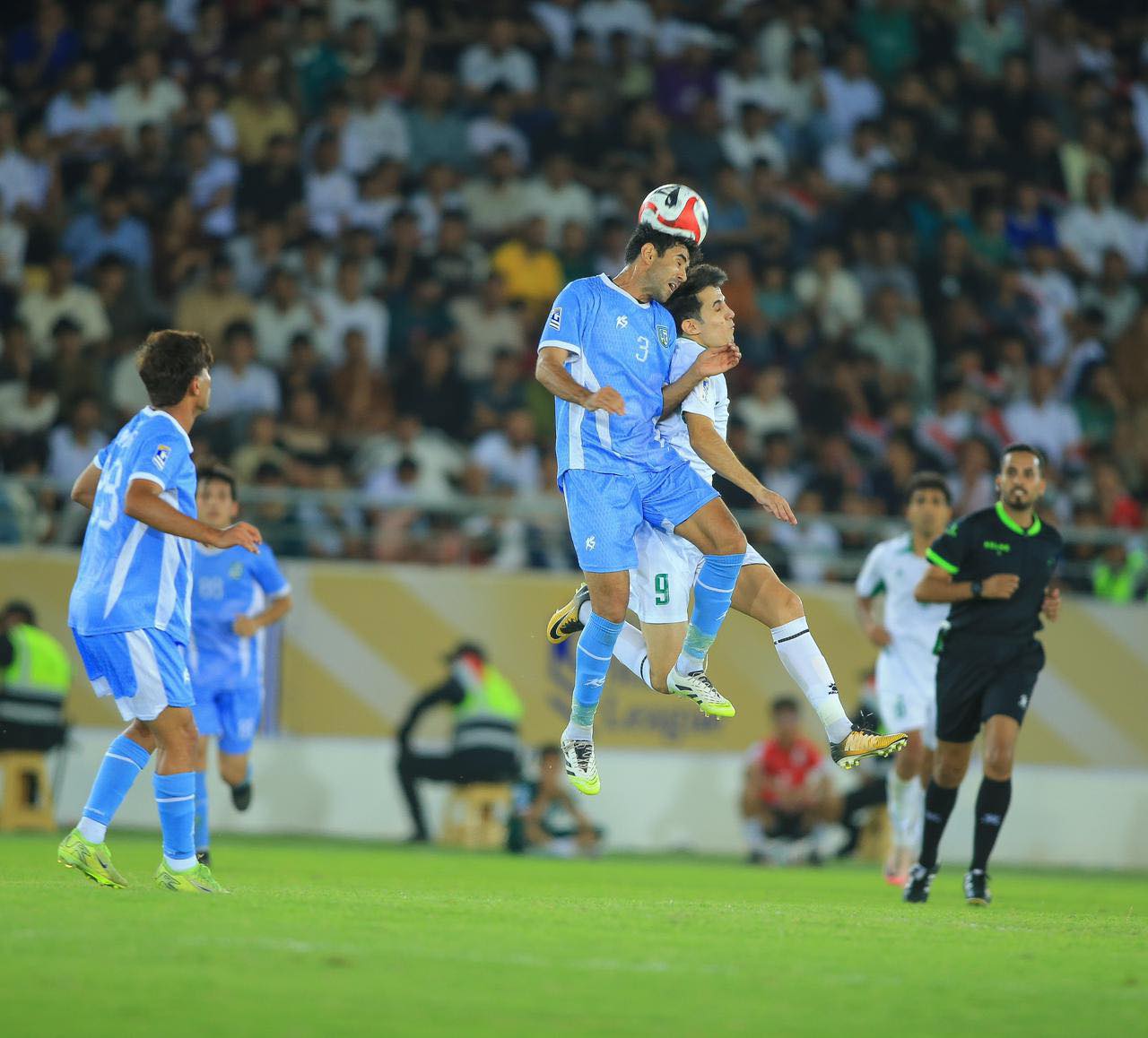 وقد أدار اللقاء طاقماً تحكيما مؤلفا من محمد كامل حكماً للساحة، واحمد سلام مساعداً أول، وعلي صباح شنيت مساعدا ثانياً، ومهند مناف حكماً رابعا، وواثق محمد حكماً لتقنية الفار.