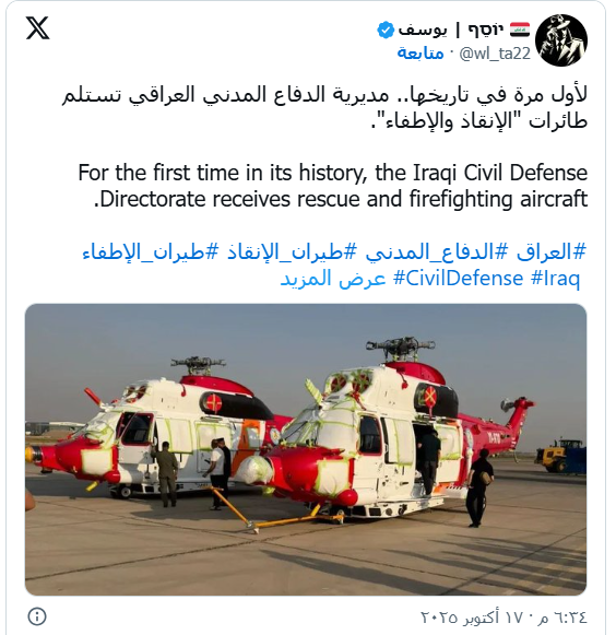 أعلنت مديرية الدفاع المدني العراقية، استلام أول دفعة من الطائرات لتعزيز قدرات الإنقاذ والإطفاء الجوي.