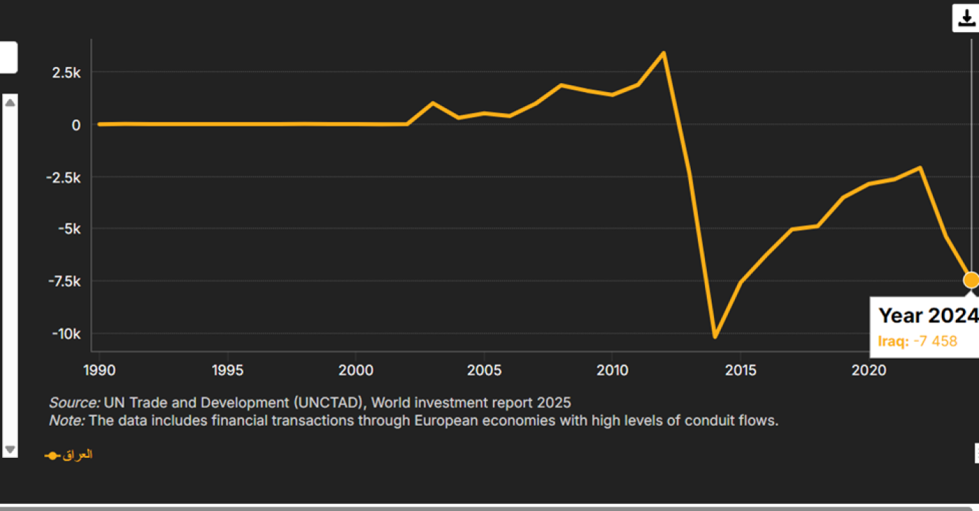 في 2022 بلغ صافي الاستثمار الأجنبي المباشر "سالب" 2.08 مليار دولار، هذا يعني ان الاستثمارات الهاربة من العراق اكبر من الداخلة الى العراق بقيمة ملياري دولار.