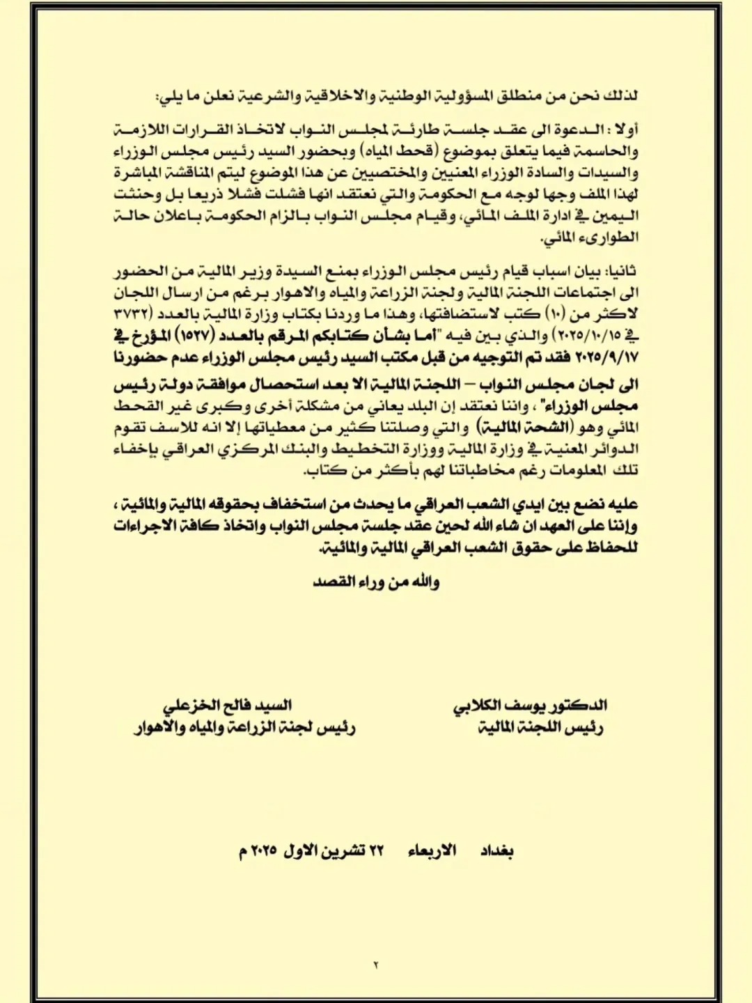 وصدر البيان المشترك من رئيس اللجنة المالية يوسف الكلابي ورئيس لجنة الزراعة والمياه والأهوار فالح الخزعلي.