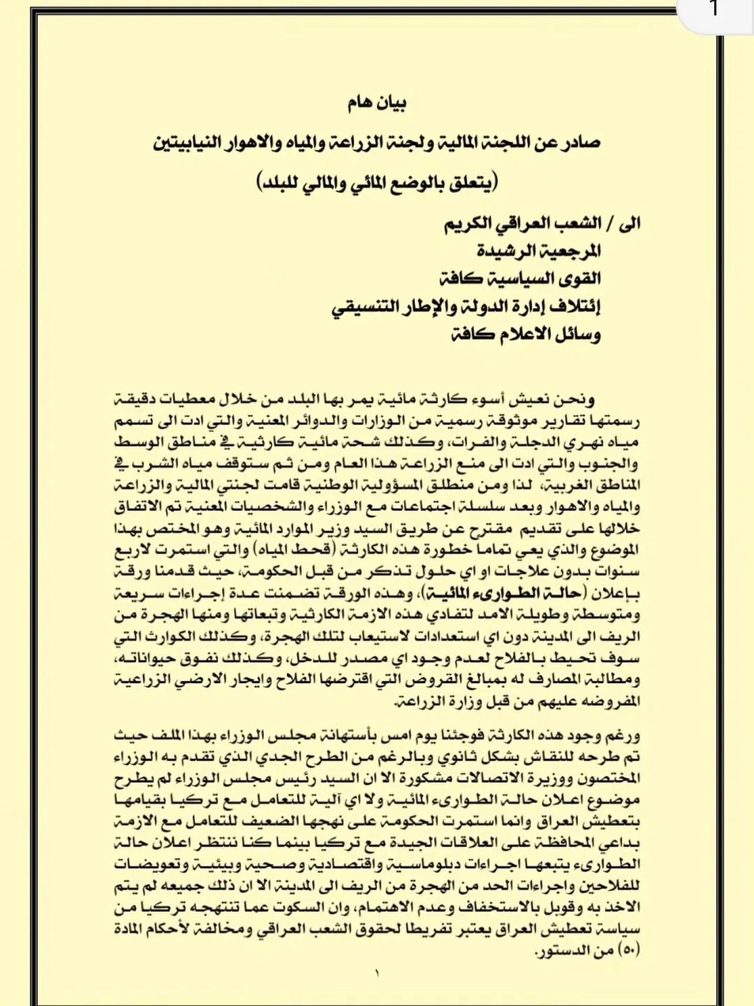 أصدرت لجنتا المالية، والزراعة والمياه والأهوار، النيابيتان، بياناً مشتركاً بشأن الوضع المائي والمالي للبلاد.