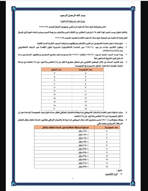 أعلنت وزارة الداخلية، اليوم الأربعاء، ضوابط منح سمات الدخول للأراضي العراقية لموسم الصيد 2025- 2026.