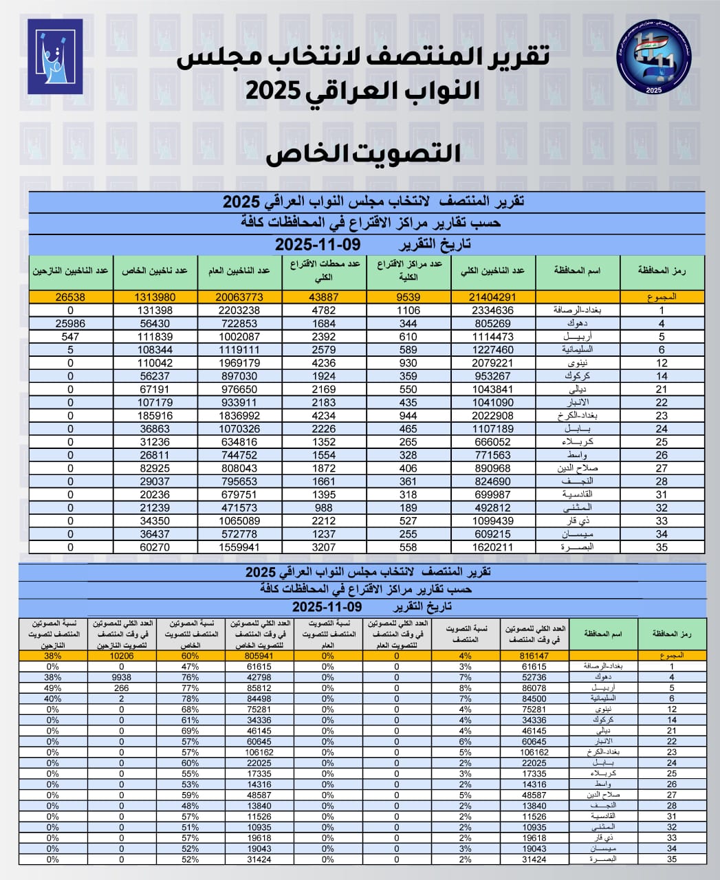 نشرت المفوضية العليا المستقلة للانتخابات بعد ظهر الأحد 09 , تشرين الثاني 2025 تقريرها المنتصف لانتخابات مجلس النواب العراقي 2025 _ التصويت الخاص.