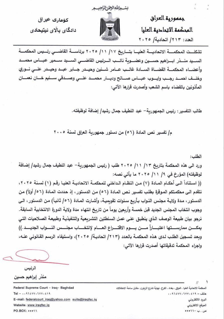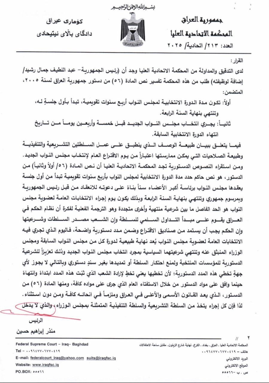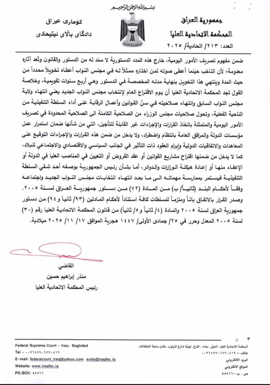 اصدرت المحكمة الاتحادية العليا، اليوم الاثنين، قراراً مهماً يقضي بإنهاء أعمال مجلس النواب الحالي وتحويل صلاحيات مجلس الوزراء " تصريف أعمال" محدودة الصلاحيات