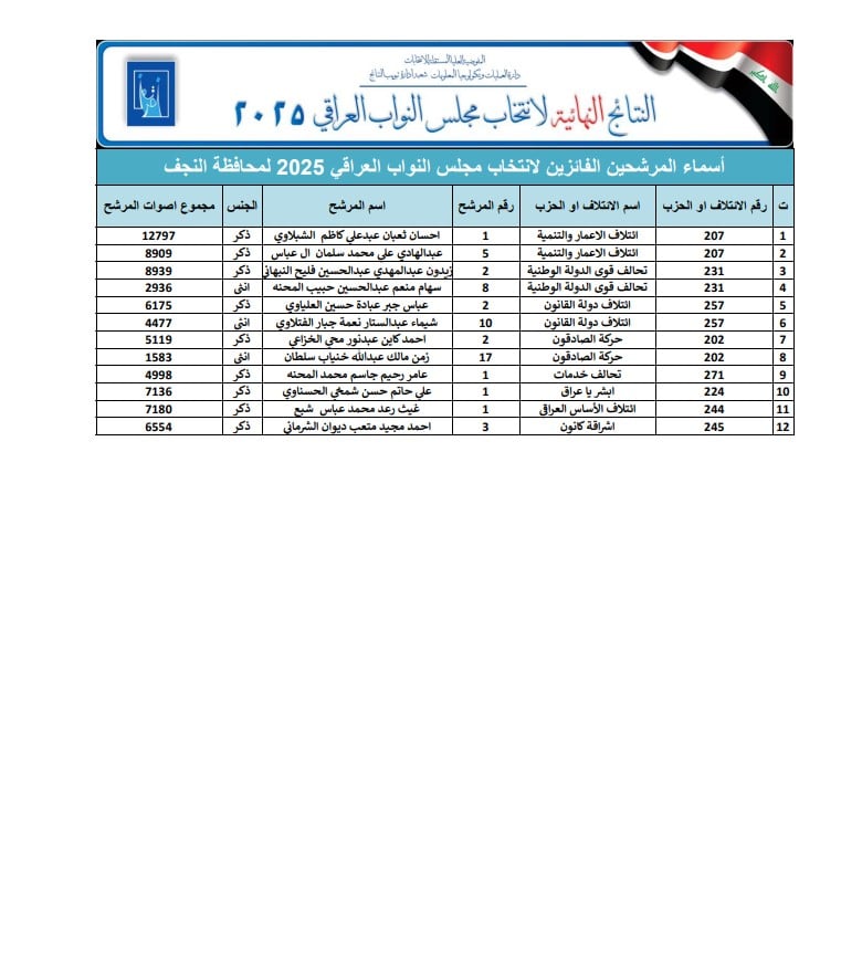 أعلنت المفوضية العليا للانتخابات، اليوم الاثنين، نتائج الانتخابات التشريعية النهائية لمحافظة النجف..