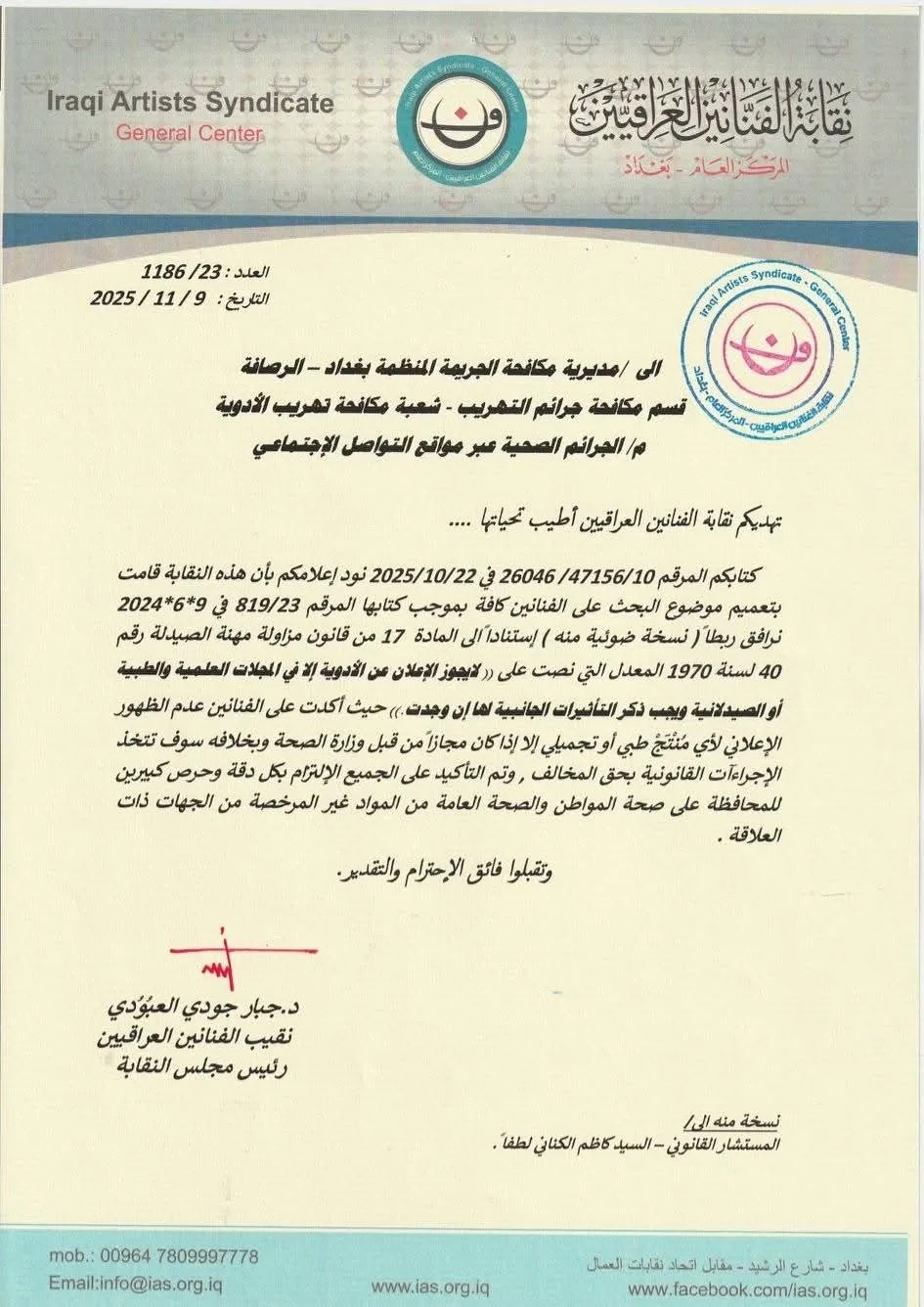 وقالت النقابة وفقاً لكتاب رسمي صادر عنها، موجّه إلى الفنانين العراقيين وفروع النقابة في المحافظات كافة، إن "قيام بعض الصفحات على مواقع التواصل الاجتماعي بالترويج والإعلان عن منتجات وأدوية ومستحضرات طبية وتجميلية غير مجازة رسمياً من الجهات الصحية المختصة، هي ممارسات تُعد جريمة يعاقب عليها القانون وفق أحكام قانون مزاولة مهنة الصيدلة رقم (40) لسنة 1970 المعدل، لما تشكله من خطر على حياة المواطنين وسلامتهم".