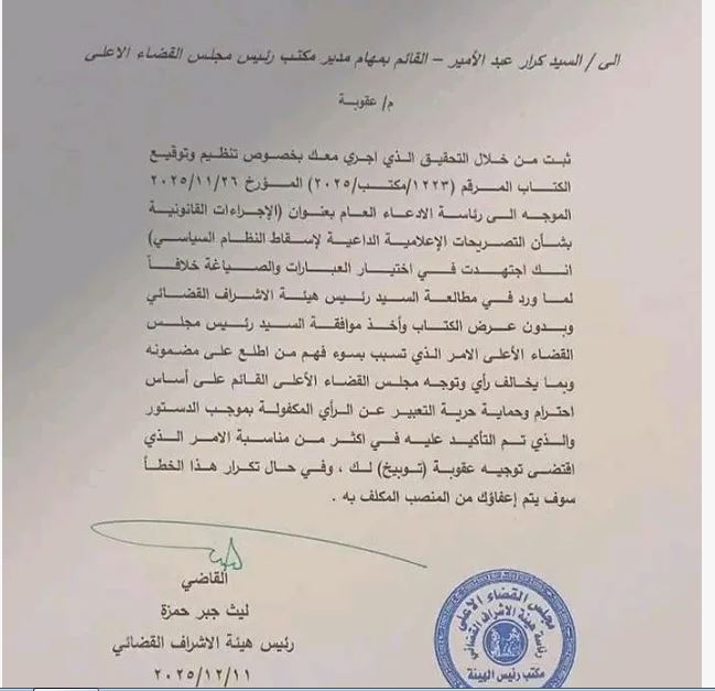 وجاء في قرار التنبيه أن التحقيق أثبت قيام الموظف (كرّار عبدالأمير) وهو مدير مكتب رئيس مجلس القضاء العراقي، بتنظيم وتوقيع كتاب يتضمن عبارات لا تدخل ضمن صلاحياته، ولا تُعد من اختصاصه القانوني، مؤكداً أن تحديد الشخوص المعنيين وإقامة الدعاوى بحقهم هو من اختصاص القاضي المختص حصراً.