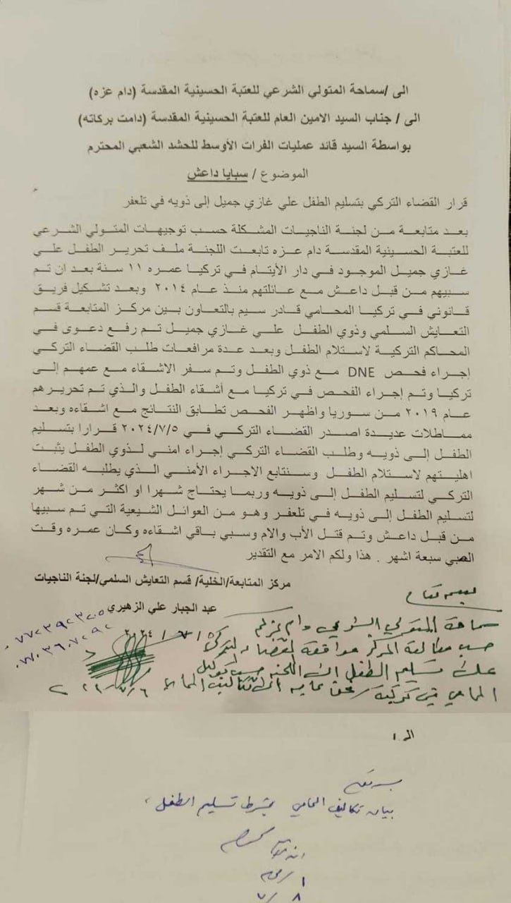 من جانبها أعلنت السفارة العراقية في أنقرة، عن إعادة طفل عراقي مختطف من قبل "داعش" منذ العام (2014) إلى ذويه بعد متابعات استمرت أكثر من عامين.
