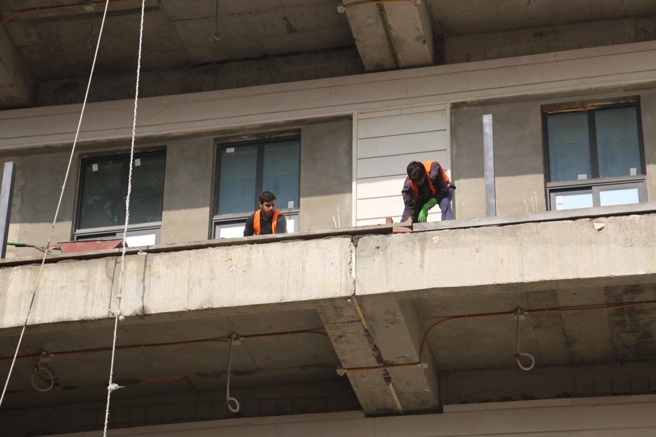 وقال مدير المشروع المهندس علي فياض في حديث لوكالة نون الحبرية ان "المشروع وصل الى مراحل متقدمة من الانجاز تقارب (90) بالمئة من المخطط له، ووصلنا حاليا الى مراحل الانهاءات الداخلية التي انهي بها عمل السقوف الثانوية "الجبسن بورد" وما تبقى هو طلاء السقوف، وانتهت اعمال رصف الارضيات بمادة "البورسلان" و"المرمر" لبعض المناطق، وحاليا يجري العمل في جدران وارضية المسبح الداخلي بسبب اختلاف نوعية مواد "السيراميك" الخاص المستخدم في رصفه، كما يجري العمل في تغليف المرمر لواجهات المصاعد التي تم نصبها وتشغيلها تجريبيا، ولم يتبقى من اعمال الانهاءات في الداخل الا الطلاء الذي ينفذ حين تنتهي جميع الاعمال التي تسبب تطاير الغبار، وينجز قبل افتتاح المشروع بايام قليلة، اما في مجال اعمال الانهاءات الخارجية فأنجز العمل بالحجر في الواجهة بمادة الحجر، وكذلك انجزت اعمال مادة " الالواح الزجاجية"(Curtain Wall)، ولم يتبقى الا مرحلة الطلاء التي يتم تأخيرها ايضا الى قبل افتتاح المشروع، وتمكنا من انجاز البنى التحتية و"مبازل" المناطق الخضراء "اللاند سكيب" والحدائق بشكل كامل، وكذلك انتهت أعمال رصف الارصفة والممرات والشوارع بالطابوق المقرنص، وتبقت مرحلة الزراعة في آخر اعمال المشروع، اما ملاعب الخماسي فقد انتهى العمل فيها من مدة طويل".