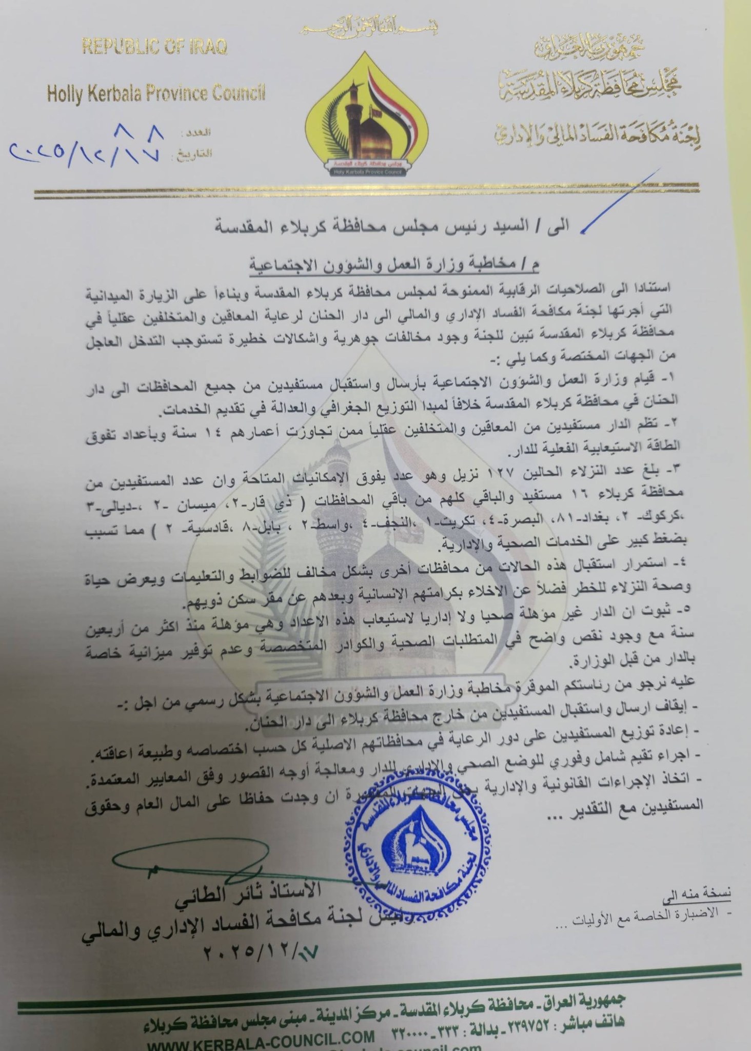 وطالب عضو مجلس محافظة كربلاء الجهات العليا بضرورة ابقاء الدار خاصة للحالات الكربلائية حصرا ومن ثم تشييد بناية بمواصفات خاصة بموقع اخر وتتضمن قاعات تراعي وضع الاعاقات النفسية عن البدنية ـ مشيرا الى ضرورة تواجد طبيب استشاري في مكتب خاص مُأمَن لمتابعة الحالات المرضية العضوية التي يعاني منها قسم من النزلاء وتحتاج الى طبيب متواجد باستمرار .