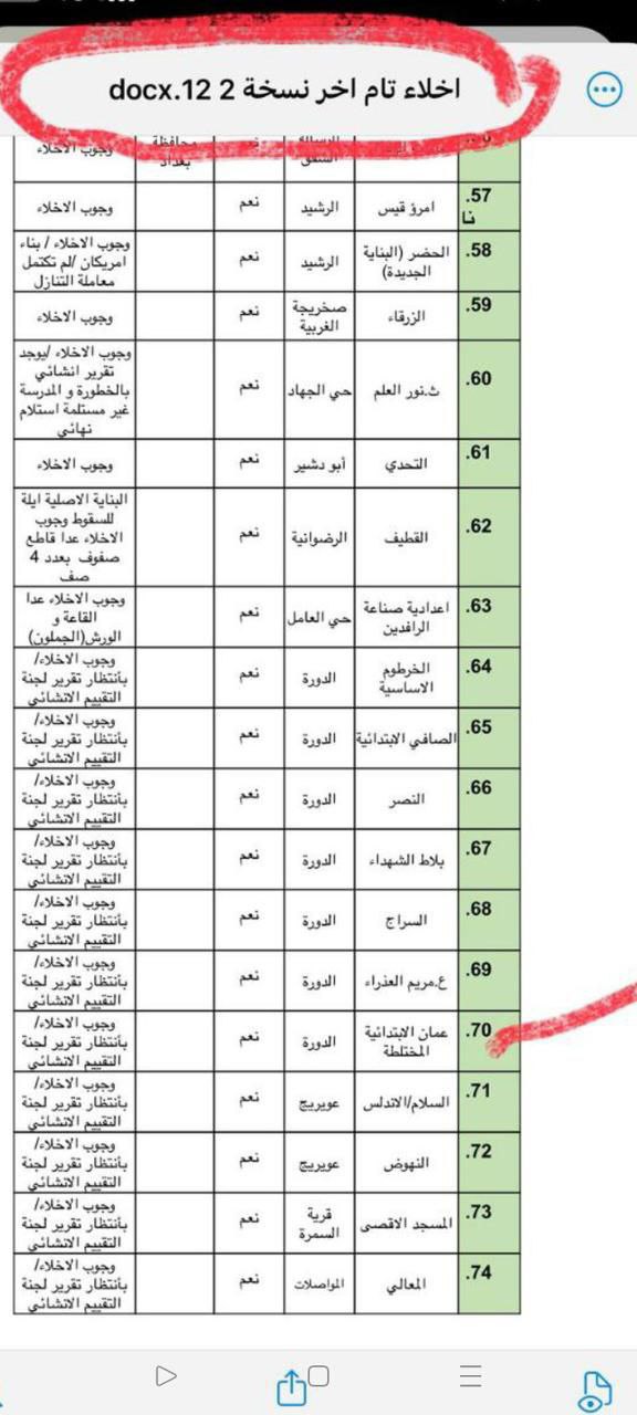 واضافت قائلة "هناك اكثر من ضرر يلحقه هذا القرار بنا ومنها على سبيل المثال اذا نقلوا مدرستنا الى المنطقة المقابلة للمواصلات فهناك ثلاث مدارس هي (البتراء وسبتة واسمرة) وهذه المدارس فيها حاليا دوامين لمدرستين وعليه سيكون دوام مدرستينا ثلاثي اي ستكون مدة الدر س بين (20 ــ 25) دقيقة وفيها تأثيرات سلبية على مستوى الطلبة وضيق الوقت على المدرس لشرح الدرس بالشكل المطلوب، وسيتدنى المستوى العلمي للطلبة مثلما حصل في حالات دمج ثلاث مدارس في بناية واحدة سابقا وحاليا، وهو اجراء ليس في مصلحة الطالب او المدرس او المدرسة ونرجو منكم ايصال صوتنا الى المسؤولين، والامر الآخر لا يعرف من اصدر هذا القرار الوضع المعاشي لأغلب العائلات محدودة الدخل التي سيضطر الكثير منها الى استئجار خطوط نقل لابنائهم وتكليفهم مبالغ مالية"، لاسيما ان " بعض الخطوط تستوفي مبلغ (60) الف دينار عراقي عن نقل الطالب الواحد، وما نخشاه ان تتحول مدرستا "المعالي" و"خولة بنت الازور" الى مصير متوسطة "الحريري" المجاورة لنا والتي اخليت منذ (7) سنوات وتركت حتى تحولت الى مكب نفيات في النهار ومنطقة موبوءة ووكر لممارسة الرذيلة والفواحش وخطر على اهالي المنطقة لتجمع المنحرفين فيها ليلا، بعد ان اخليت وابلغوا الادارة انها سيعاد بنائها خلال اشهر ولم تبنى فيها طابوقة واحدة الى الآن، وعلى القائمين واصحاب القرار اعادة النظر بأمر الاخلاء لبناية واحدة يدرس فيها (1200) طالب فما بالك بعشرات الآلاف من الطلبة الذين يداومون في (150) مدرسة"، مستدركة بالقول انه" على حد قول اللجنة المكلفة بالكشف على المدرسة احيلت الى الترميم فقط وليس الهدم كونها غير آيلة للسقوط، والمفروض ينفذ الترميم في العطلة الصيفية، بل نحن مستعدون كأولياء امور ان نرممها من جيوبنا الخاصة في عطلة نصف السنة ولا نعطي مبررا لتوقف الدراسة".