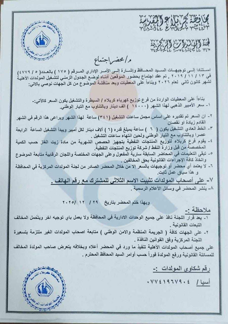 أفاد مصدر حكومي في محافظة كربلاء المقدسة، اليوم الثلاثاء، أن لجنة المولدات المركزية في المحافظة، حددت سعر "أمبير" المولدات الأهلية لشهر كانون الثاني 2026.