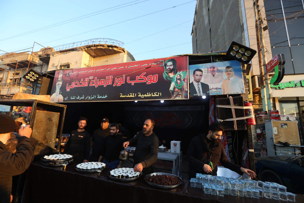 ويستمر "ابو غيث" في سرد حكاية موكبه وخدمتهم قائلا " لا تقتصر خدمتنا لاهل البيت على ذكرى استشهاد الائمة في مدينة الكاظمية المقدسة بل نحيي جميع مناسبات اهل البيت من الولادات والوفيات وتنظيم الزيارات في النجف الاشرف وكربلاء وسامراء المقدستين وقضاء بلد عند "السيد محمـد" ونطبق مقولة الامام الصادق (عليه السلام) "احيوا ذكرنا رحم الله من احيا ذكرنا""، مؤكدا ان" التحول في الخدمة حصل بعد زوال نظام الطاغية المقبور في العام (2003) وانفراج الامور وحضور ملايين الزائرين في المدن المقدسة وانا وقفت هنا في ساحة الزهراء بالكاظمية وكانت عندي عربة خشبية واصنع فيها الشاي بطباخ نفطي صغير واوزعه مع الكعك، وبدأت اطور الخدمة عندما انظم معي عدد من اهالي الكاظمية، وكذلك تعرفت على الشباب من اهل البياع فالتحقوا بنا وشرعنا بتقديم خدمات الاطعام والشراب لايام عدة ومنها نستمر من الصباح الى صباح اليوم التالي، ومنحنا الفرصة لكثير من الزائرين للمشاركة في تقديم الخدمة، وفي احد الايام حصلت معي حادثة حيث اخبرتني احدى الزائرات ان هناك رجل يقف عند عمود الكهرباء ويبكي بحرقة فهل تستطيع مساعدته، وبعد تهدئته والاستفسار منه تبين انه مصاب بـ"ورم سرطاني" ويريد ان يخدم الامام موسى بن جعفر عسى الله ان يشفيه بشفاعته، وفعلا منحته فرصة الخدمة على قدر استطاعته وذهب وفي سنوات "جائحة كورونا" حيث توقفت الخدمة لمدة ثلاث سنوات، جاء شخص يسأل عني وعندما عرفته بنفسي قال لي انا الذي كنت مصابا بالسرطان والحمد لله شفيت من المرض بقدرة الله وشفاعته الامام "موسى بن جعفر" (عليهما السلام)، وهناك حادثة اخرى يعرفها المقربون مني ومنهم صديق لي من محافظة البصرة "علي البصراوي" حيث نفذت الاموال التي خصصتها للانفاق على الموكب وتبقى للزيارة اليومان الاخيران وهما الاكثر خدمة لان زخم الزائرين وذروتهم فيها، فتوجت الى "كاظم الغيظ" ودموعي تجري بحرقة وخاطبته هل ترضى يا بن رسول الله ان تأتي الي زوارك وموكبي فارغ لا لقمة طعام فيه، وبعد ساعة جاء طفل لا يتجاوز عمره عشر سنوات وصاح بصوت عالي "عمي ابو غيث" فقلت له اذهب يا ولدي لا يوجد شيء في الموكب" فرد علي" لا عمي هاي فلوس دزهه ابوية الك حتى تصرفها على الموكب" فأخذتها وقمت بعدها فوجدتها مبلغ معتد به يكفيني لتقديم الخدمة الى نهاية الزيارة وقلت للشباب الذين معي ائتوني بهذا الطفل لنعرف من هو والده لنقدم له الشكر، فخرجوا ولم يجدوا اثرا له".