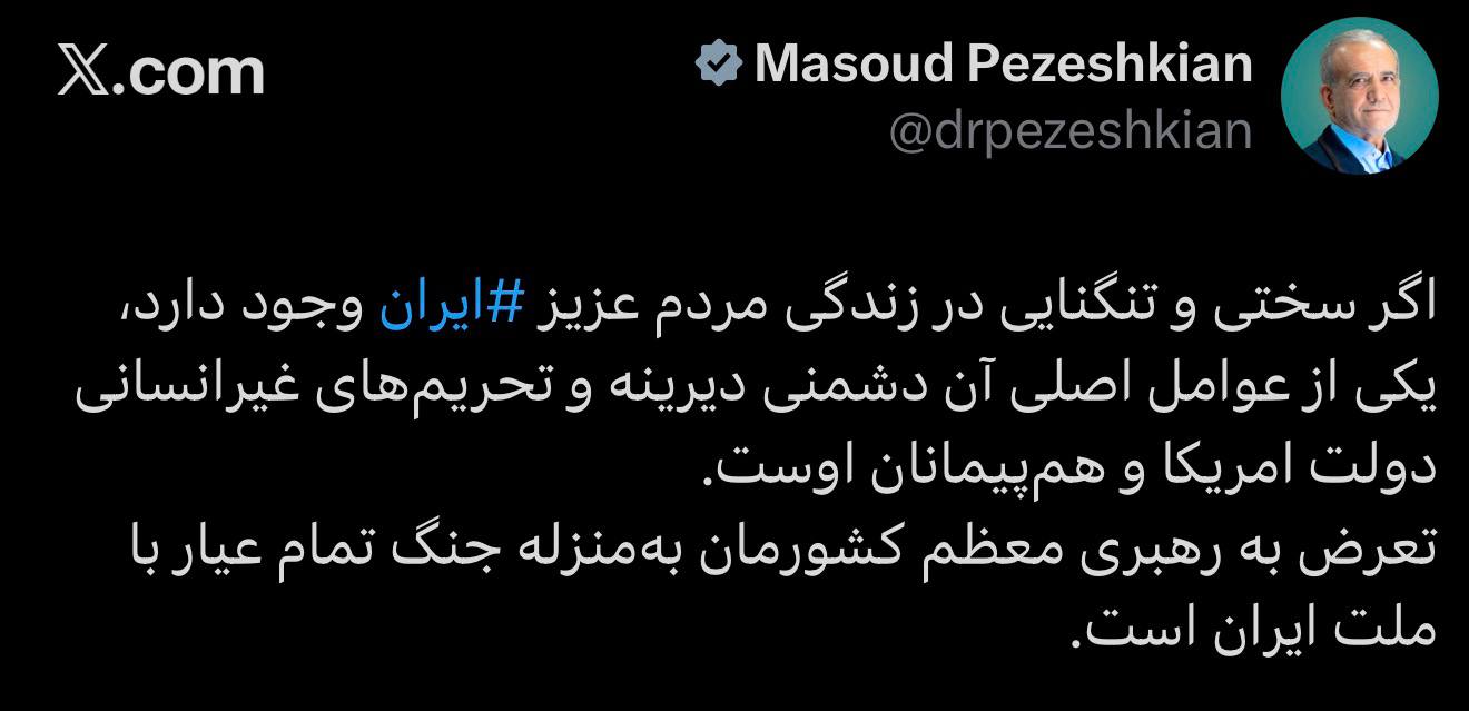 وقال بيزشكيان، في تغريدة له على منصة "إكس"، تابعتها وكالة نون الخبرية، إن "الهجوم على المرشد الأعلى لبلادنا يرقى إلى مستوى الحرب الشاملة ضد الأمة الإيرانية".