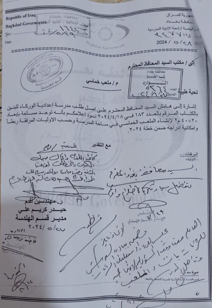 واضاف قائلا ان" الامور عندما توقفت امام حاجز عدم وجود التخصيصات المالية توجهنا لنطرق ابواب اخرى سعيا من الادارة لترميم بناية المدرسة فكان مراجعتنا هذه المرة الى محافظة بغداد واستحصلنا موافقة بجهود شخصية بمساعدة ولي امر احد طلبتنا ويعمل مهندسا في المحافظة، وتعاون معنا في متابعة اي كتاب يخص طلبنا واي موافقة يحتاجها، حتى تمكنا من استحصال موافقة محافظة بغداد شخصيا على مشروعين الاول يتضمن انشاء ملعب خماسي "تارتان" في ساحة المدرسة الترابية لكي يكون متنفسا للطلاب من جهة ويمكنهم ممارسة الرياضة في ساحة نظامية بمواصفات عالمية، وكذلك انجاز اعمال الصيانة والترميم لأي اضرار في المدرسة وفي مقدمتها السياج الخارجي المهدم ضمن مبادرة رئيس مجلس الوزراء "محمـد شياع السوداني"، ولكن فوجئنا ان احدى الموظفات المسؤولات ادرجت مدرستنا في جداول المشاريع التي سيتم تأهيلها بالتتابع وحسب الاوقات المحددة وليس استثناءً او افضلية كما اشار اليه هامش محافظ بغداد"، مؤكدا ان" ادارة المدرسة ابلغت التربية بأن باقي اجزاء السياج الخارجي آيلة للسقوط، وكما توقعنا فقد سقط جزء آخر منه قبل ايام وباقي الاجزاء على وشك السقوط، وكذلك جزء علوي من سقف المدرسة آيل للسقوط تساقط جزء منه، وهو امر سيعرض الطلبة للخطر او لدخول الكلاب السائبة التي انتشرت كظاهرة في كثير من المحافظات ومنها العاصمة بغداد والكل على اطلاع بما فعلته تلك الكلاب بالاطفال او الناس، بالرغم من ان المدرسة اتخذت تدابير مهمة في تواجد المدرسين خلال الفرص بين الدروس ودرس الرياضة في الساحة والتعاون مع الاهالي الذين تحيط بيوتهم بالمدرسة على عدم السماح لاي احد بالدخول الى بنايتها، لكن الخطر يبقى قائم".