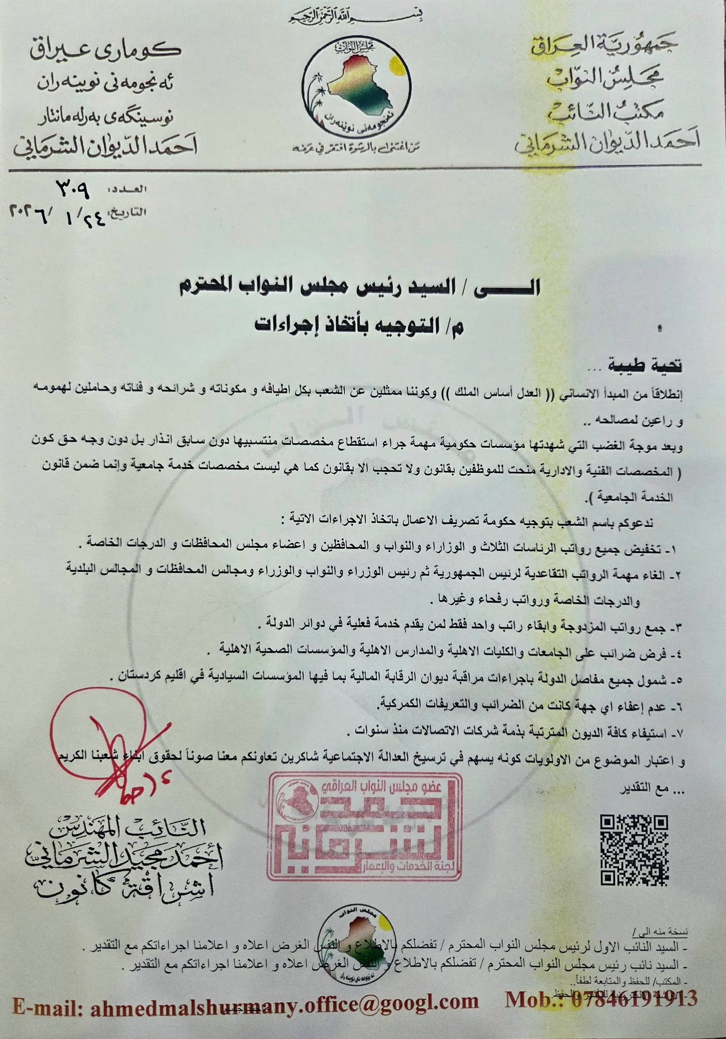 وقال الشرماني في كتابه، تنشره أدناه وكالة نون الخبرية، إن مؤسسات حكومية مهمة شهدت خلال الفترة الماضية استقطاع مخصصات منتسبيها دون سابق إنذار أو وجه حق، رغم أن تلك المخصصات منحت بقانون ولا تخضع للاجتهاد، وليست مخصصات خدمة جامعية وإنما ضمن قانون الخدمة الجامعية.