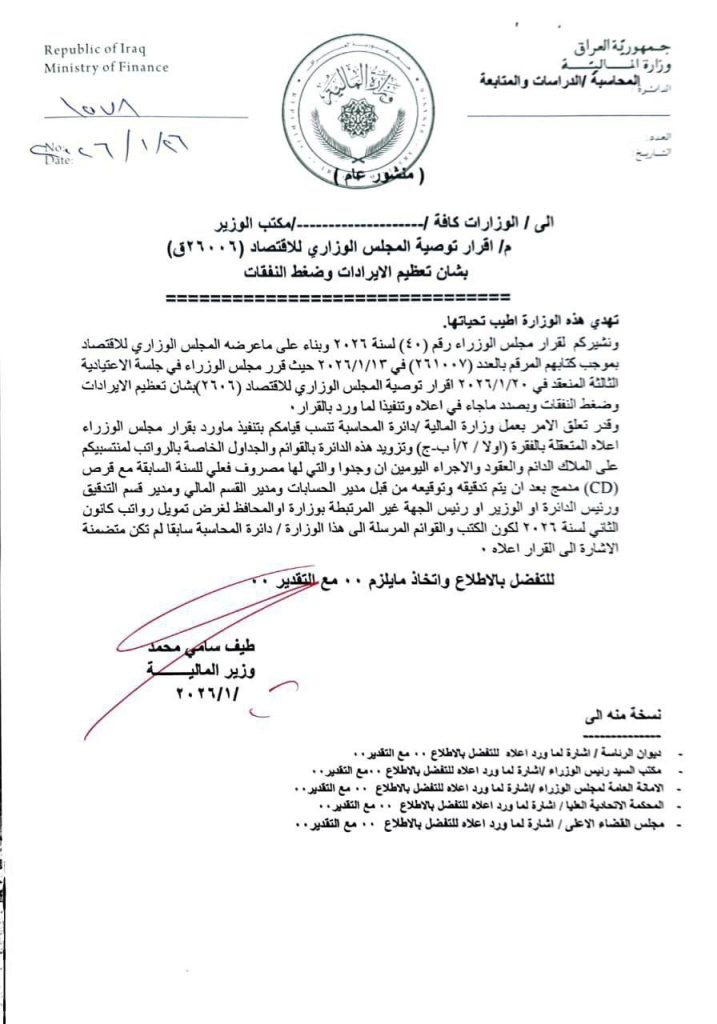 وذكرت المالية في بيان تلقته وكالة نون أن “وزيرة المالية طيف سامي تجدد دعوتها الجهات كافة بتزويدها بالقوائم والجداول الخاصة بالرواتب لمنتسبيها على الملاك الدائم والعقود والأجراء اليوميين أن يكونوا المصروف فعلياً للسنة السابقة مع قرص (CD) مدمج بعد أن يتم تدقيقه وتوقيعه من قبل مدير الحسابات ومدير القسم المالي ومدير قسم التدقيق ورئيس الدائرة أو الوزير أو رئيس الجهة غير المرتبطة بوزارة أو المحافظ أو من يخوله قانوناً”.