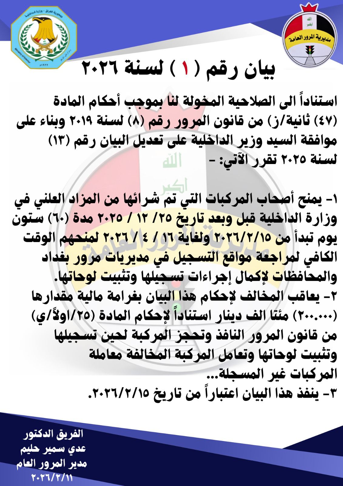 ولفتت المديرية إلى أنه "يُمنح أصحاب المركبات التي تم شراؤها من المزاد العلني في وزارة الداخلية قبل وبعد تاريخ 25/12/2025 مدة 60 يوماً تبدأ من 15/2/2026 ولغاية 16/4/2026، وذلك لإتاحة الوقت الكافي لهم لمراجعة مواقع التسجيل في مديريات مرور بغداد والمحافظات واستكمال إجراءات تسجيل المركبات وتثبيت لوحاتها".