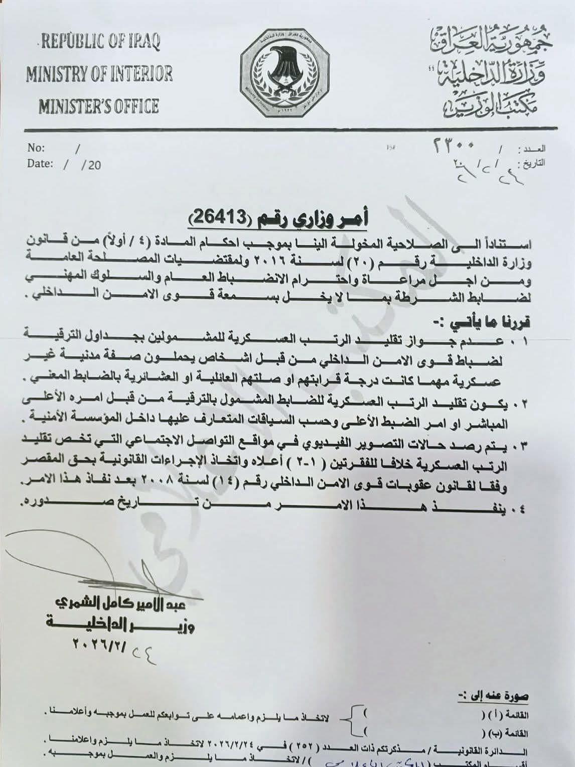 ووفقا لكتاب رسمي مذيل بتوقيع وزير الداخلية عبد الامير الشمري بتاريخ 24 من شهر شباط الجاري، فإنه "قرر عدم جواز تقليد الرتب العسكرية للمشمولين بجداول الترقية لضباط قوى الأمن الداخلي من قبل أشخاص يحملون صفة مدنية غير عسكرية مهما كانت درجة قرابتهم أو صلتهم العائلية او العشائرية بالضابط المعني".