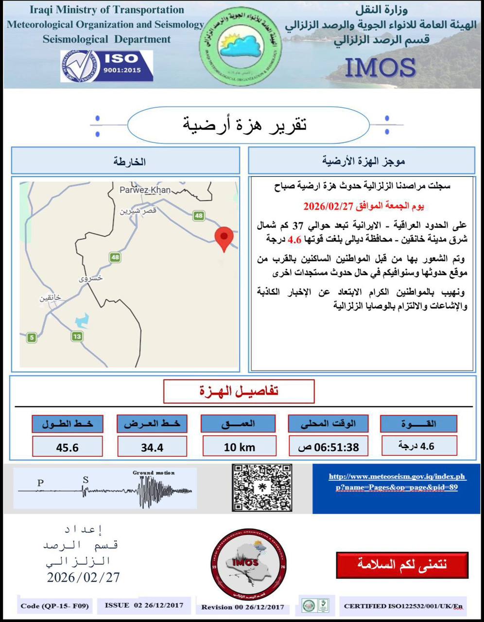 وأضاف البيان أن "الهزة الارضية سجلت صباح اليوم الجمعة وتبعد الهزة الارضية حوالي (37) كم شمال شرق مدينة خانقين من محافظة ديالى"، لافتا الى أنه "تم الشعور بها من قبل المواطنين الساكنين بالقرب من موقع حدوثها".