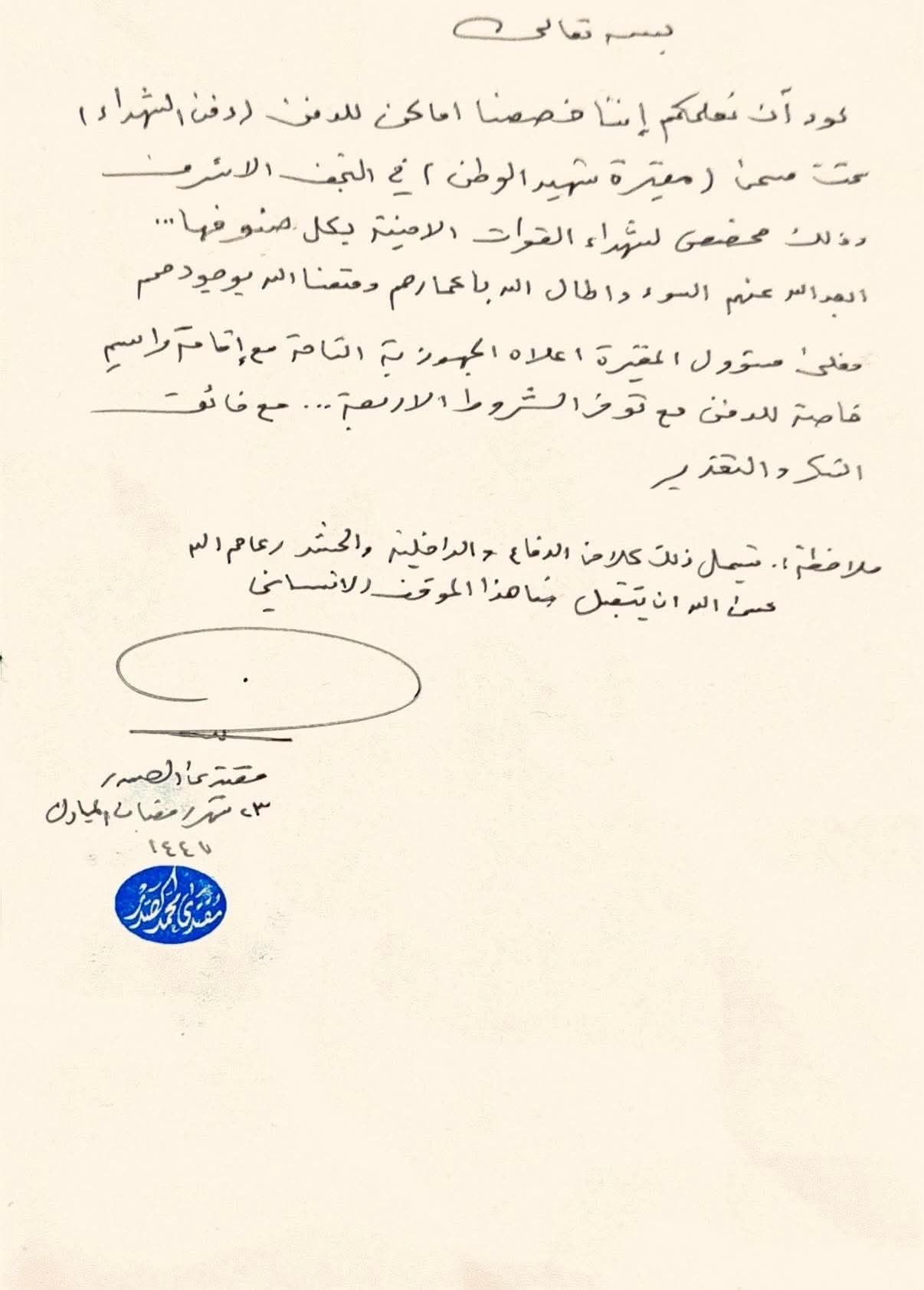 ووجه الصدر في بيان حمل توقيعه وختمه ،بان تكون المقبرة مخصصة لدفن الشهداء تحت مسمى " مقبرة شهيد الوطن".