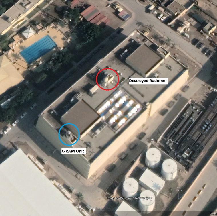 وبحسب المصدر، فإن منظومة الدفاع الجوي الأميركية (C-RAM) لم تتمكن من اعتراض الطائرة المسيّرة "مجهولة الهوية" التي نفذت الهجوم، رغم قربها من موقع الاستهداف، مما أدى إلى إصابة المنظومة الفضائية بشكل مباشر.