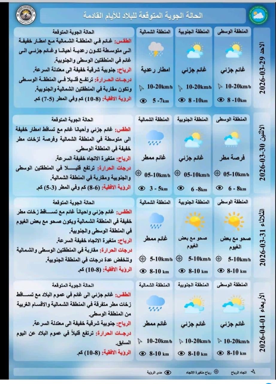 وتابعت أن "درجات الحرارة العظمى ليوم غدٍ الأحد ستكون في المنطقة الجنوبية بين (24-26) وفي المنطقة الوسطى بين (19-23) وفي المنطقة الشمالية بين (14-18)".