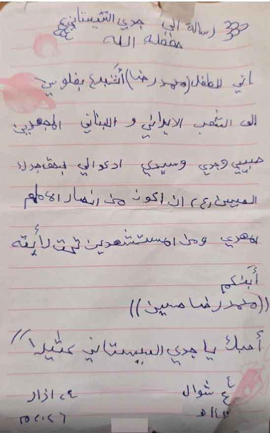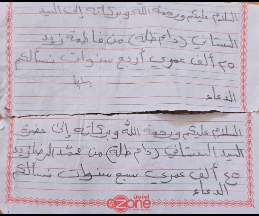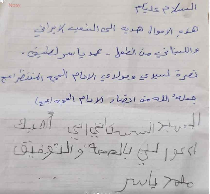 تنشر وكالة نون الخبرية مجموعة رسائل لاطفال هبـّوا لاغاثة الشعبين اللبناني والايراني حيث تبرعوا بمصروفهم المدخر تلبية لنداء المرجعية العليا بالنجف الاشرف وكتبوا رسائل عفوية الى سماحة المرجع الاعلى عبروا بها عن تضامنهم مع نداء سماحته في دعم الشعبين اللبناني والايراني المظلومين