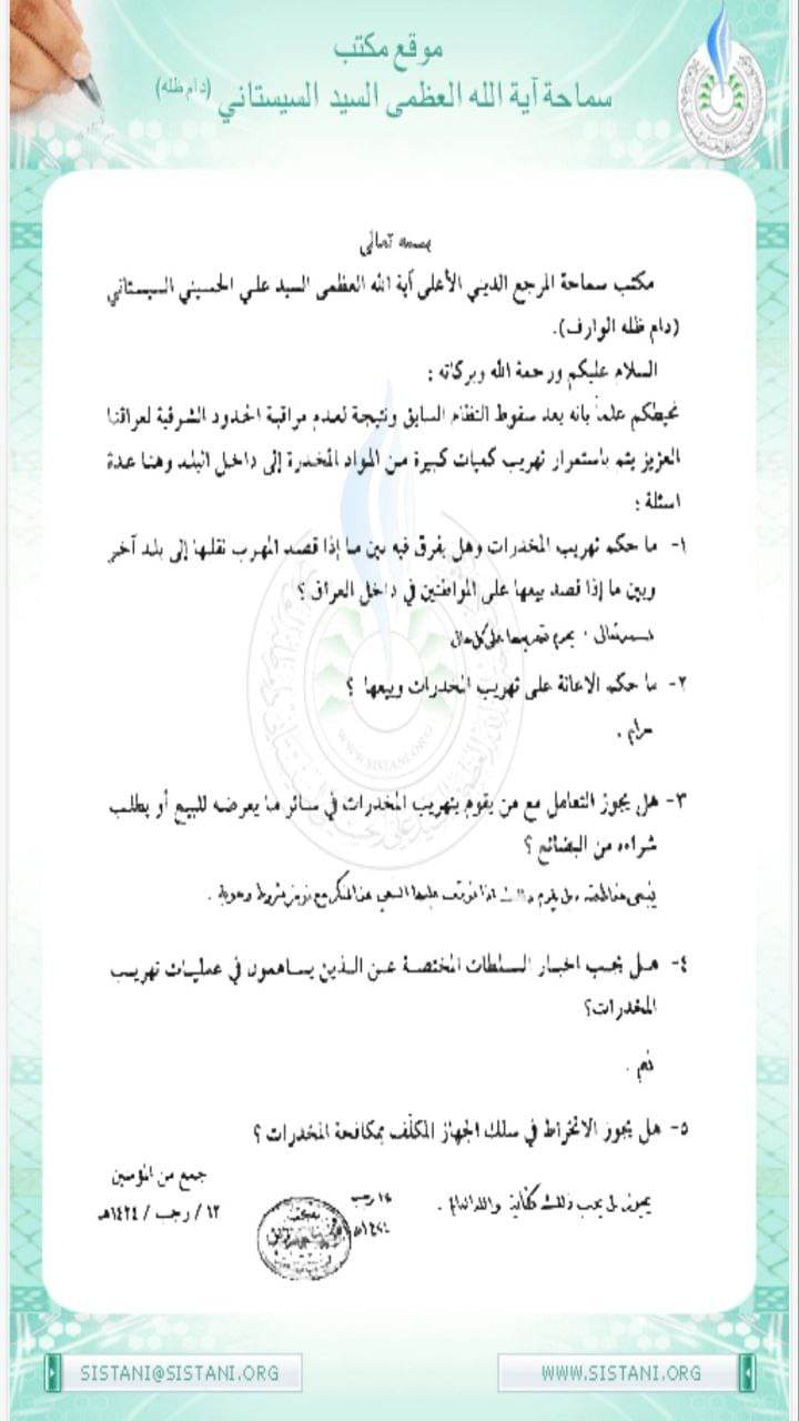قبل عشرون عاما وتحديدا في الثاني عشر من شهر رجب من العام الهجري (1424) اي في العام (2003) ميلادي اصدر مكتب المرجع الديني الاعلى السيد علي السيستاني مجموعة استفتاءات ترد على أسئلة موجهة تخص المخدرات وضعف السيطرة على الحدود وتهريبها الى العراق وما حكم تهريبها سواء الى داخل العراق او لغرض نقلها الى بلد آخر وكان الجواب (يحرم تهريبها على كل حال) وهو نسف وتحريم لكل تجارة المخدرات، والحقها بالجواب على حكم من يعين على تهريبها بـ(حرام)، ولم يكتفي بذلك بل اجاب عن جواز التعامل مع من يهرب المخدرات ويعرض بضائع اخرى غيرها للبيع بالرد (ينبغي مقاطعته، بل يلزم ذلك اذا توقف عليها النهي عن المنكر مع توفر شروط وجوبه)، وعن التطوع في سلك الجهاز الامني المكلف بمكافحة المخدرات اجاب (يجوز ذلك بل كفاية)، كما لم يجوز تعاطيها وحكم على الاموال التي تجنى من تجارتها بالحرمة بجوابه (هذه الاموال سحت ولا يجوز التصرف فيها بل يجب ارجاعها الى اصحابها ان عرفهم وإلا تصدق بها على المستحقين من الفقراء)، واوجب كذلك اخبار السلطات عن الذين يساهمون في عمليات تهريب المخدرات".