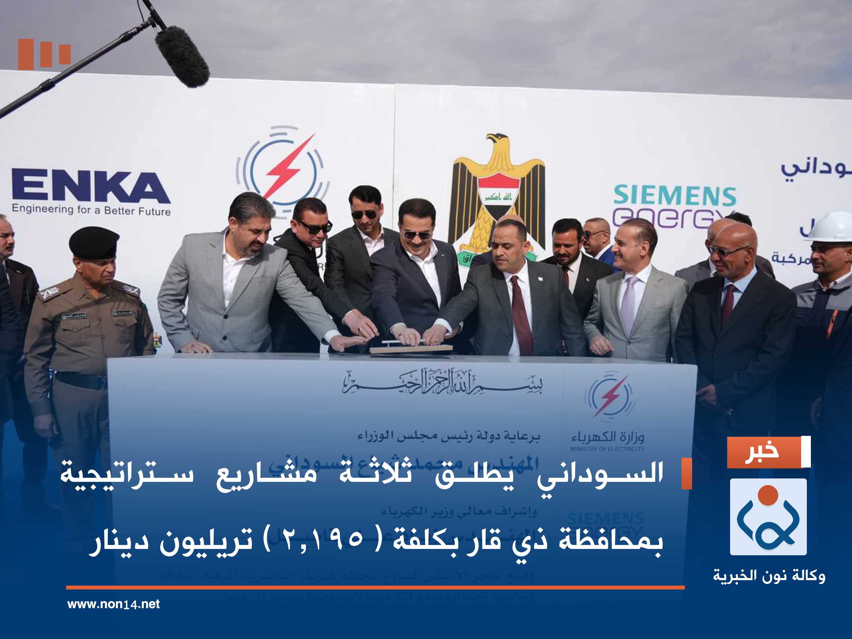اطلق رئيس مجلس الوزراء محمد شياع السوداني الأعمال التنفيذية في ثلاثة مشاريع ستراتيجية بمحافظة ذي قار، بكلفة كلية تصل الى ( 2.195 ) تريليون دينار.