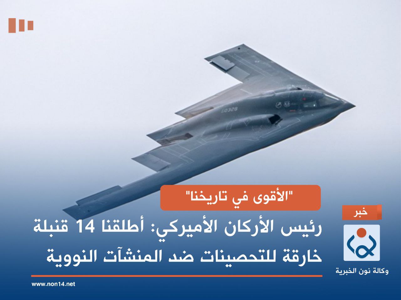 اكد رئيس هيئة الأركان الأمريكية دان كين، اليوم الأحد، ان ضرب المنشآت الإيرانية تم بسرية كاملة، واستخدم فيها 14 قنبلة خارقة للتحصينات.