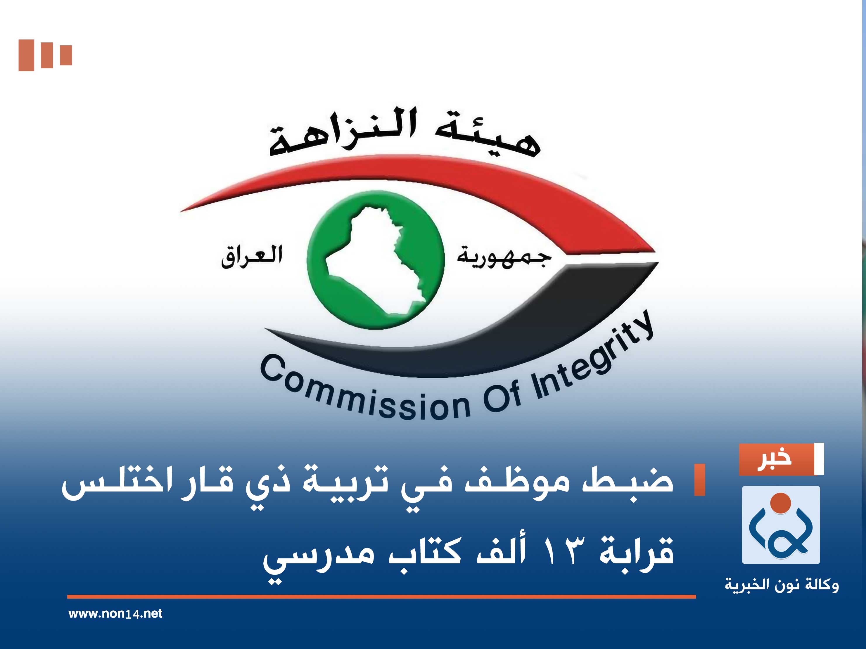 أعلنت هيئة النزاهة الاتحاديَّة، اليوم السبت، أنها تمكنت من تنفيذ عمليَّة ضبطٍ بحقّ مُوظَّفٍ في مُديريَّة التربية بمُحافظة ذي قار، جرَّاء اختلاسه كتباً ومناهج دراسيَّة مُخصَّصة للتوزيع بين الطلبة مجاناً.