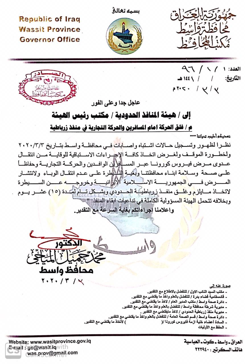 وجه محافظ واسط محمد المياحي، الاربعاء، بغلق منفذ زرباطية الحدودي لمدة 15 يوما.