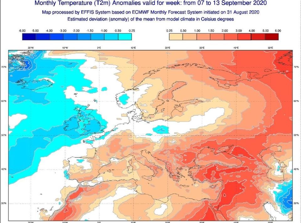 وأورد عطية خارطة المركز الاوروبي لتوقعات الطقس متوسطة المدى، وأوضح انها تشير لاستمرار التطرف لما بعد منتصف أيلول او حتى الثلث الاخير منه.