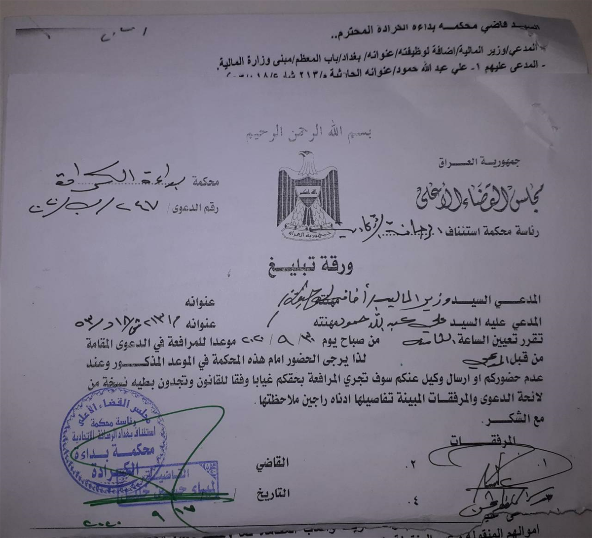 وبينت وثيقة مسربة أن وزير المالية علي عبد الامير علاوي رفع دعوى أمام القضاء ضد النائب علي الصجري يطالب فيها بإجبار الأخير على إعادة مبلغ ٥٤ مليار دينار كان قد استلمها من مبلغ كلي يبلغ ٩٤ مليارا كان قد استحصل قرارا بدفعها له من مؤسسة الشهداء كتعويض عن قيام النظام السابق بإعدام والده لأسباب سياسية واعتباره شهيداً.