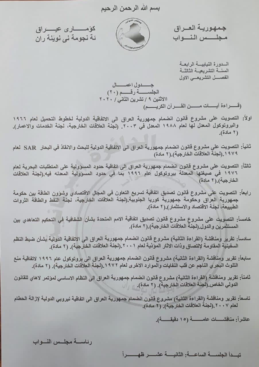 ويتضمن جدول الأعمال انضمام العراق الى عدد من الاتفاقيات، من دون الاشارة الى التصويت على مشروع الاقتراض الداخلي لسد العجز المالي
