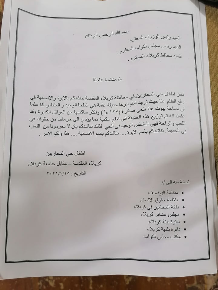 وناشد اهالي الحي محافظ كربلاء ونواب المحافظ ونواب المحافظة وجميع الخيرين واصحاب القرار بايقاف هذه الجريمة حيث اغلب البيوت فيها عوائل كبيرة ومزدحمة مع صغر المساحة والبناء المتهالك وان توزيع هذه الحديقة كقطع سكنية هي الحكم باالموت والخنق لسكان هذا الحي على حد تعبيرهم