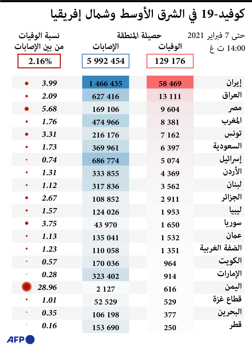 وأفادت الوكالة عن وصول عدد إجمالي الوفيات في منطقة الشرق الأوسط وشمال أفريقيا إلى 129 ألف و176، وتسجيل 5 مليون و992 ألفاً و454 إصابة، مع نسبة 2.16 في المائة وفيات عامة بين مرضى الكوفيد.