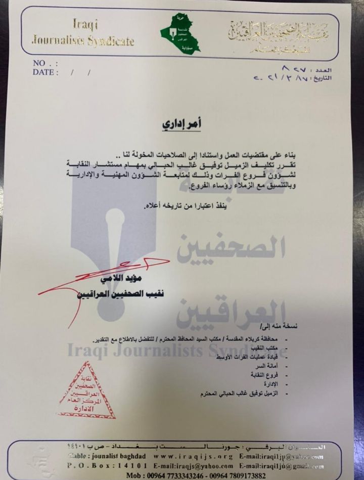 وبحسب كتاب حصلت وكالة نون الخبرية على نسخته اليوم فان الحبالي الذي حصل على 43 صوتا خلال الانتخابات التي جرت يوم 13 شباط الماضي بفارق ستة اصوات على منافسه حسين الشمري الذي تراس فرع النقابة خلال الانتخابات سيقوم بمتابعة الشؤون المهنية والادارية بالتنسيق مع رؤساء الفروع بالمحافظات .