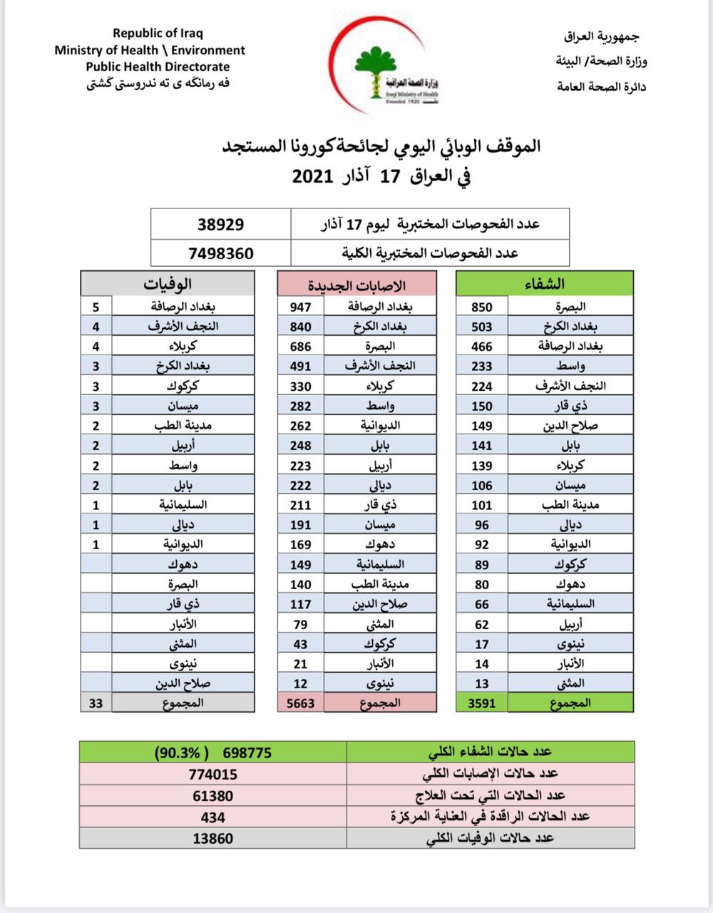 سجلت وزارة الصحة العراقية، اليوم الأربعاء، 33 وفاة و5663 إصابة جديدة بفيروس كورونا، إلى جانب 3591 حالة شفاء خلال 24 ساعة الماضية.