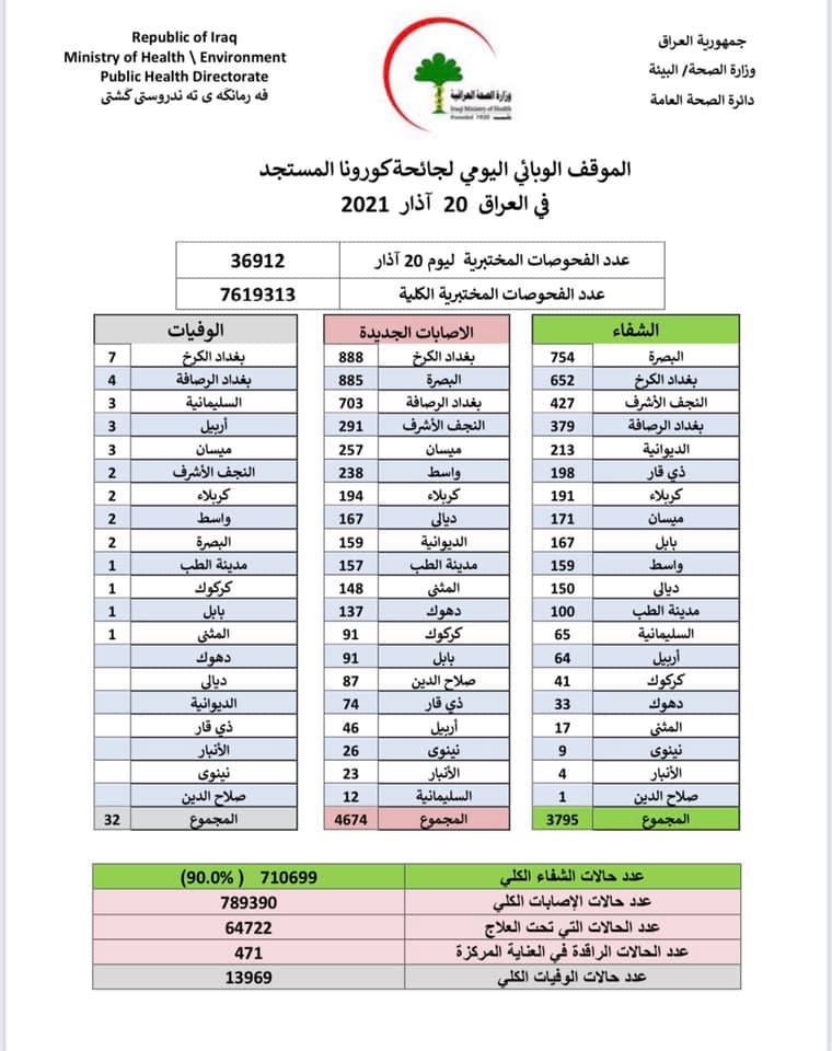 وبلغ إجمالي الإصابات بفيروس كورونا في عموم العراق 789390 اصابة، بينما ارتفع معدل الشفاء الكلي إلى 710699، في حين بلغ إجمالي عدد الوفيات في العراق 13969 وفاة.