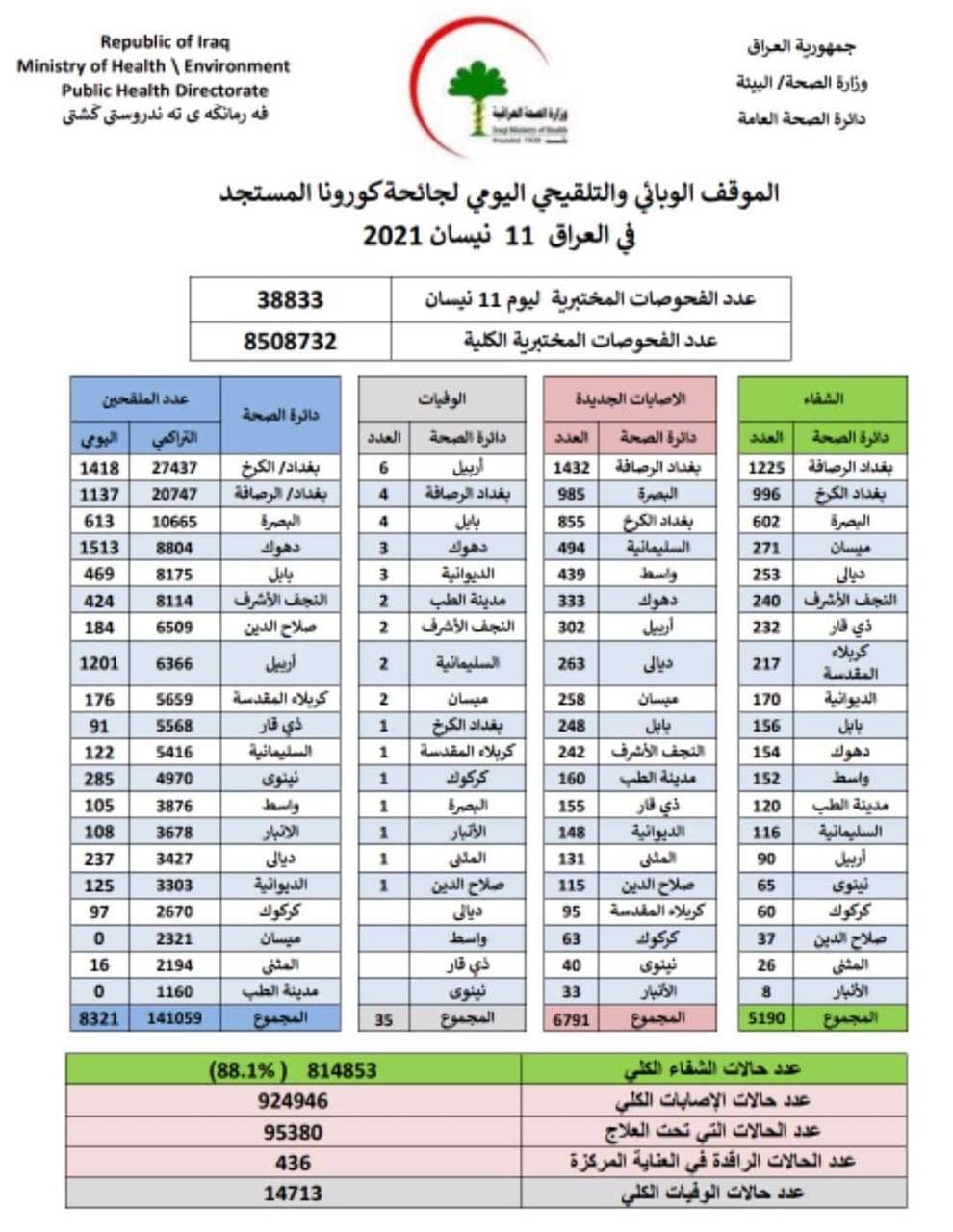 وقالت الوزارة في بيان حصلت وكالة نون عليه إن "الكوادر الصحية سجلت 6791 إصابة جديدة بالفايروس، فيما تماثل 5190 مصاباً للشفاء، وقابل ذلك وفاة 35 مصاباً بالفايروس خلال المدة المذكورة".