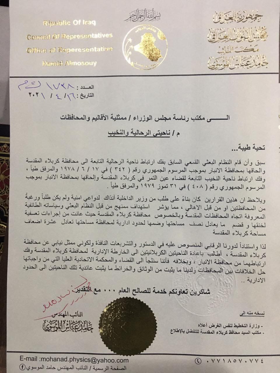 وبحسب الوثيقة، قال الموسوي، " نطالب بأعادة ناحيتي النخيب والرحالية الى محافظة كربلاء وفك أرتباطهما بمحافظة الأنبار، بخلافه سنلجأ الى قضاء والمحكمة الاتحادية العليا التي من واجباتها حل الخلافات بين المحافظات، ولدينا ما يثبت من الوثائق والخرائط ما يثبت عائدية تلك الناحيتين الى الحدود الادارية للمحافظة".